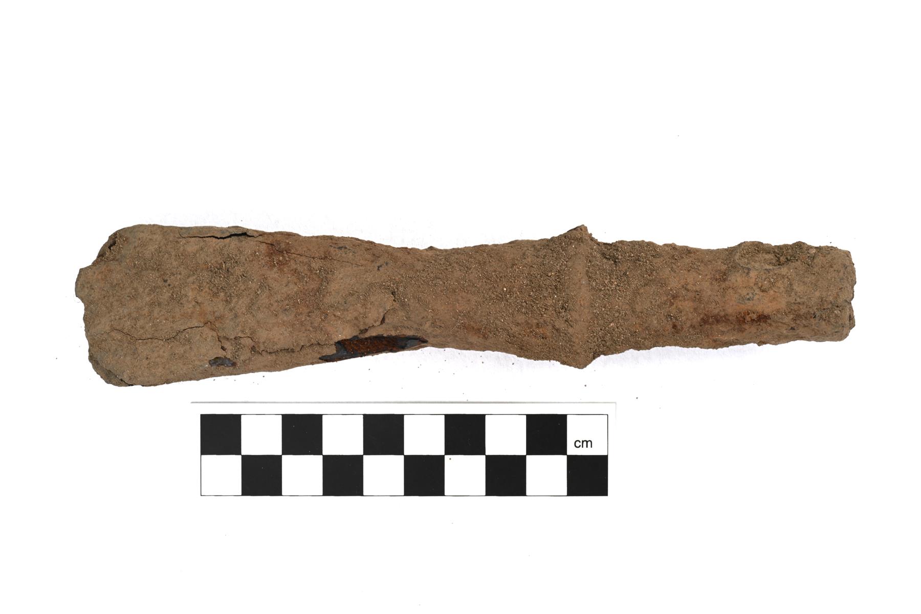 | Kapeateräinen tappikirves. Ruodon poikkileikkaus on pyöreä. Ruodon ja terän liitoskohtaa kiertää kohoharja. Terä levenee teränsuuta kohti. Mahdollista korvaketta tai sen jäänteitä ei ole havaittavissa. Ks. Salo Taf. 49. | |
