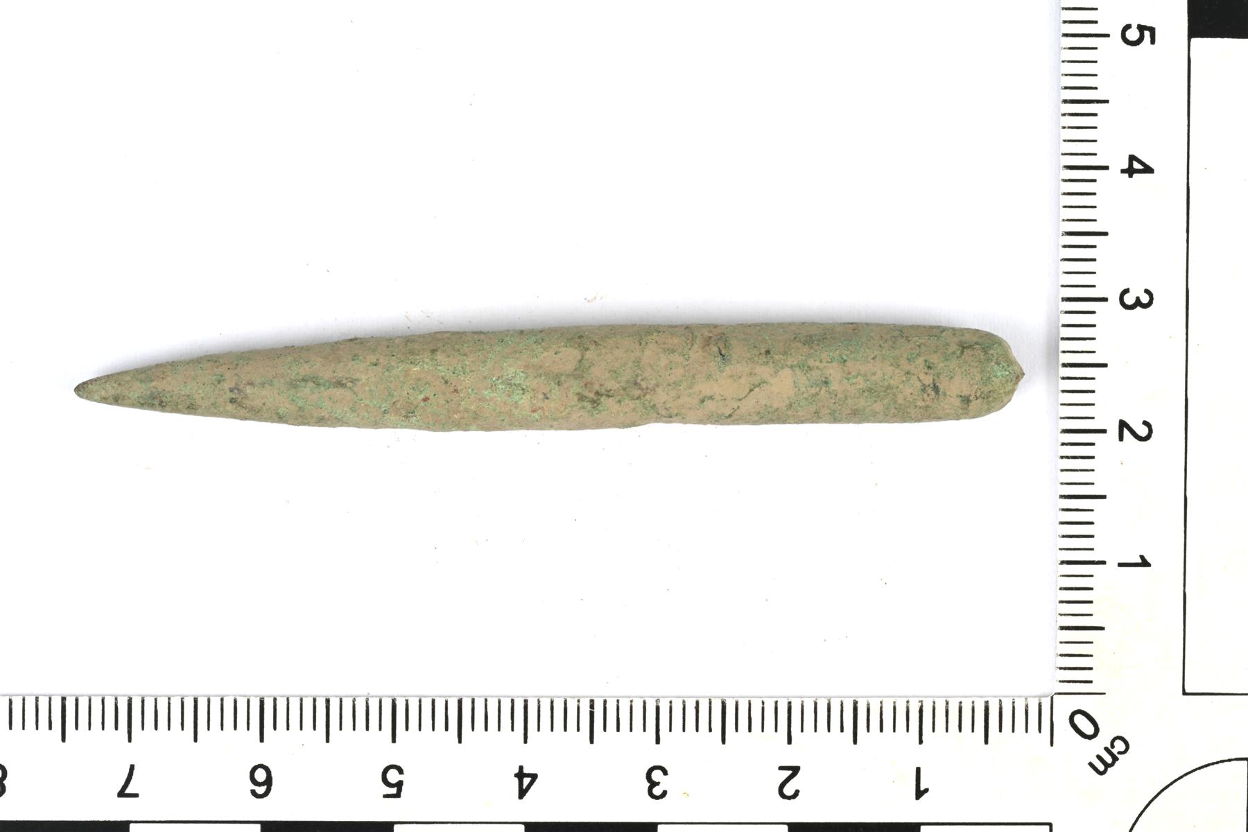 | Toiseen päähän kapenevan kupariseosvartaan katkelma. Kulunut. | |