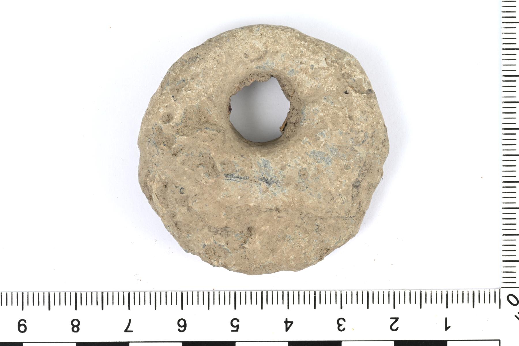 | Pyöreä lyijypaino. Reunassa on reikä. | |