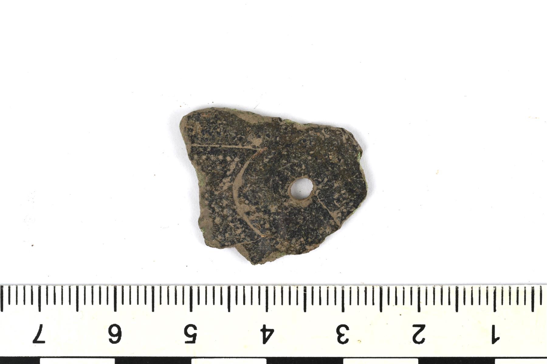 | Viiva- ja pisteviivakoristeisen kupariseoslevyn katkelma. | |