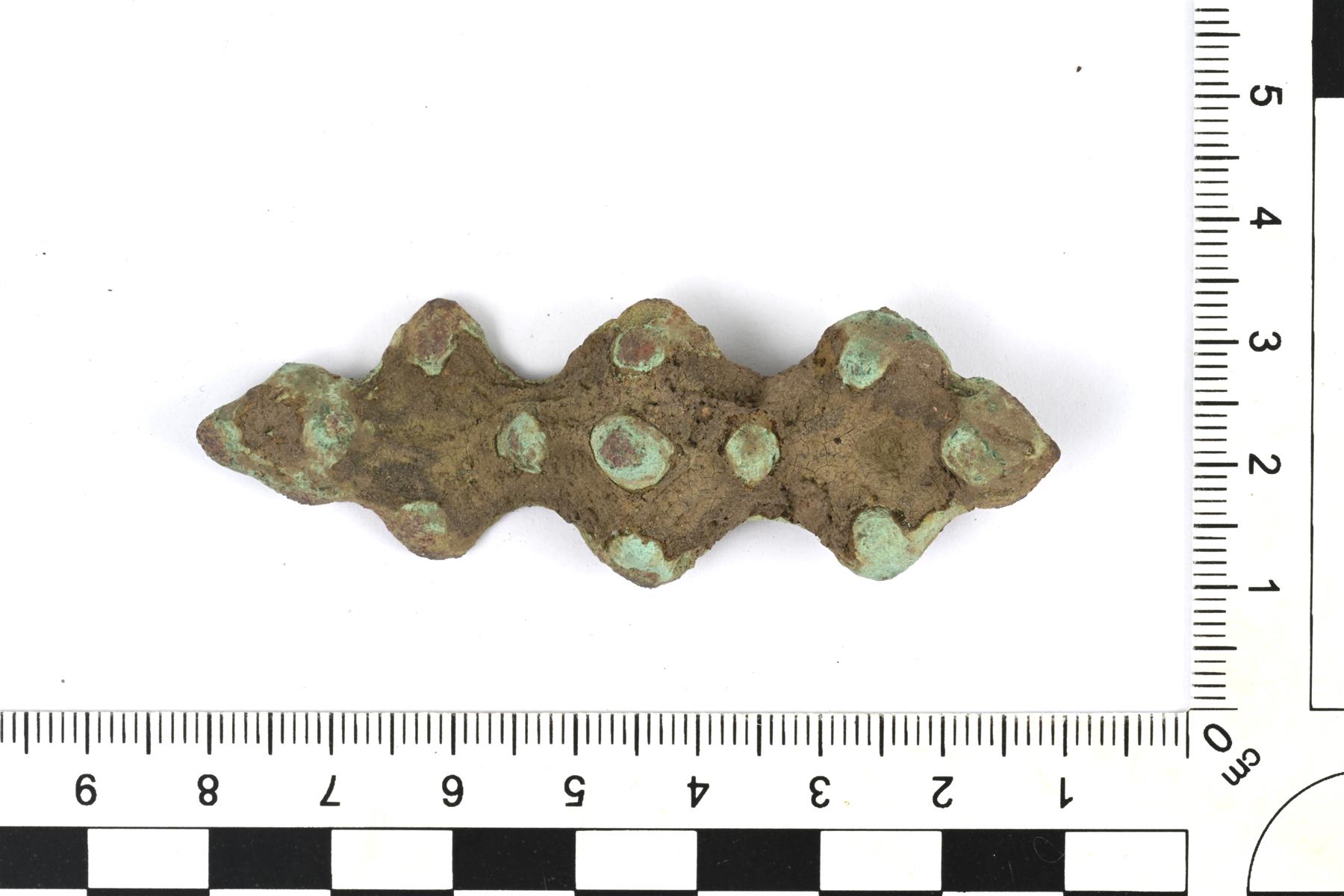 | Lähes kokonaisena säilynyt tasavarsisolki, neulakota on hajonnut. Koristeluna tappeja ja viivakuviointia. Taustapuolella on kaksi neulan kiinnityslenkkiä. | |