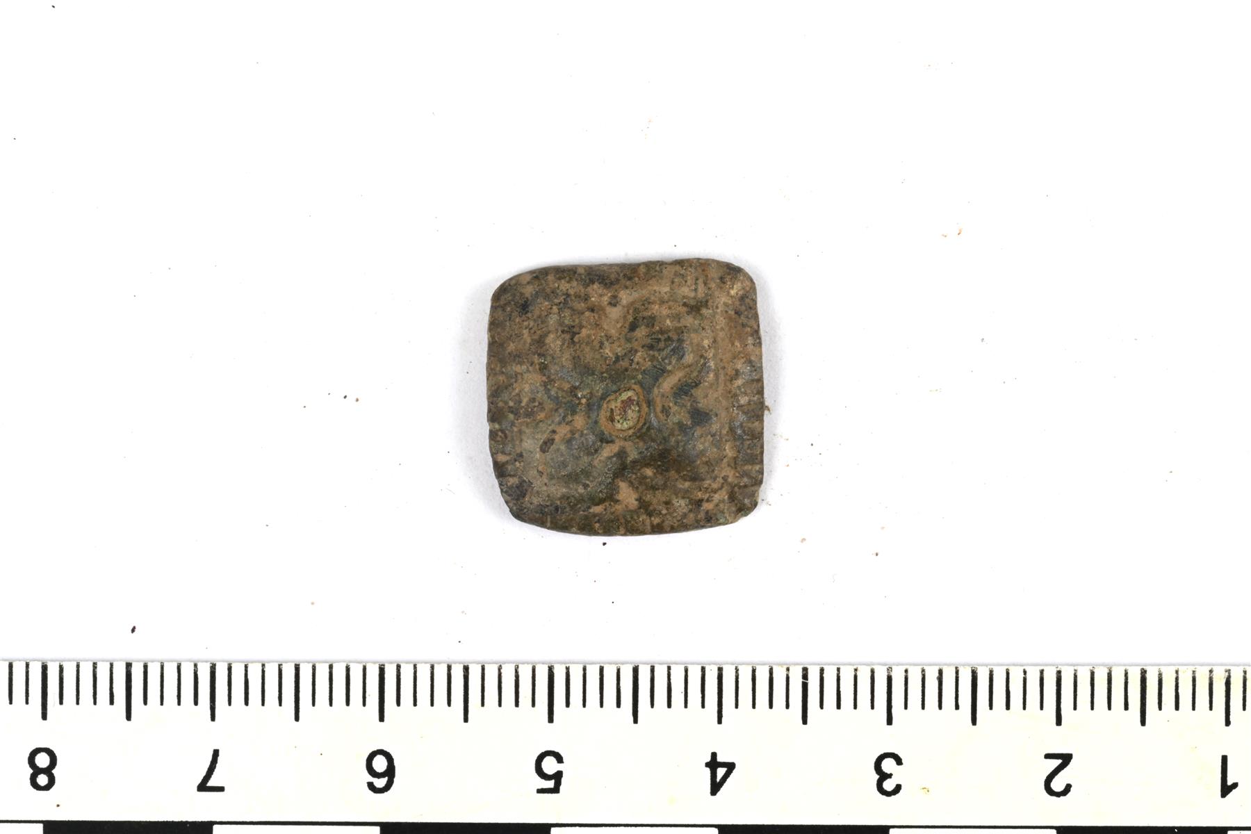 | Kulunut ruusukehela. Koristeluna kohokuvioinen vinoristi. Keskellä on reikä ja niitin jäänne. | |