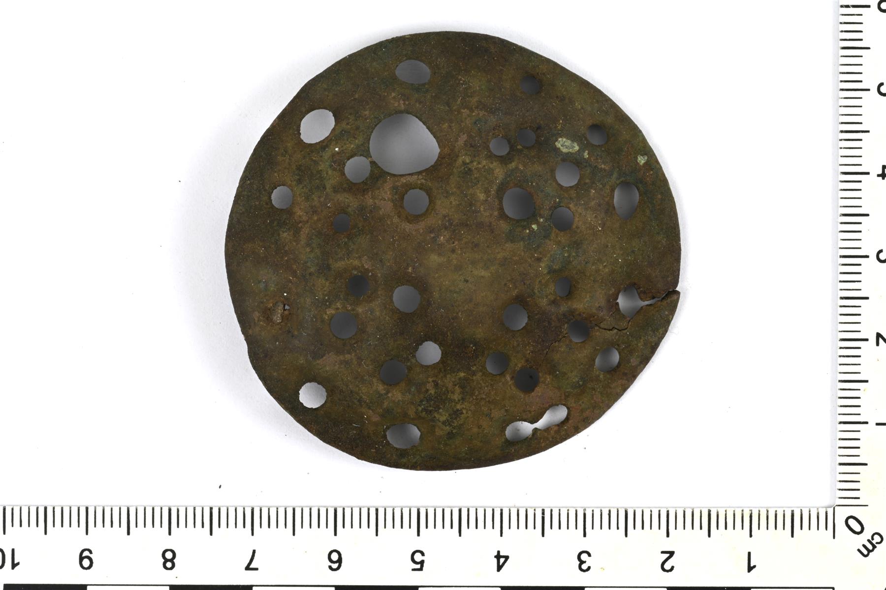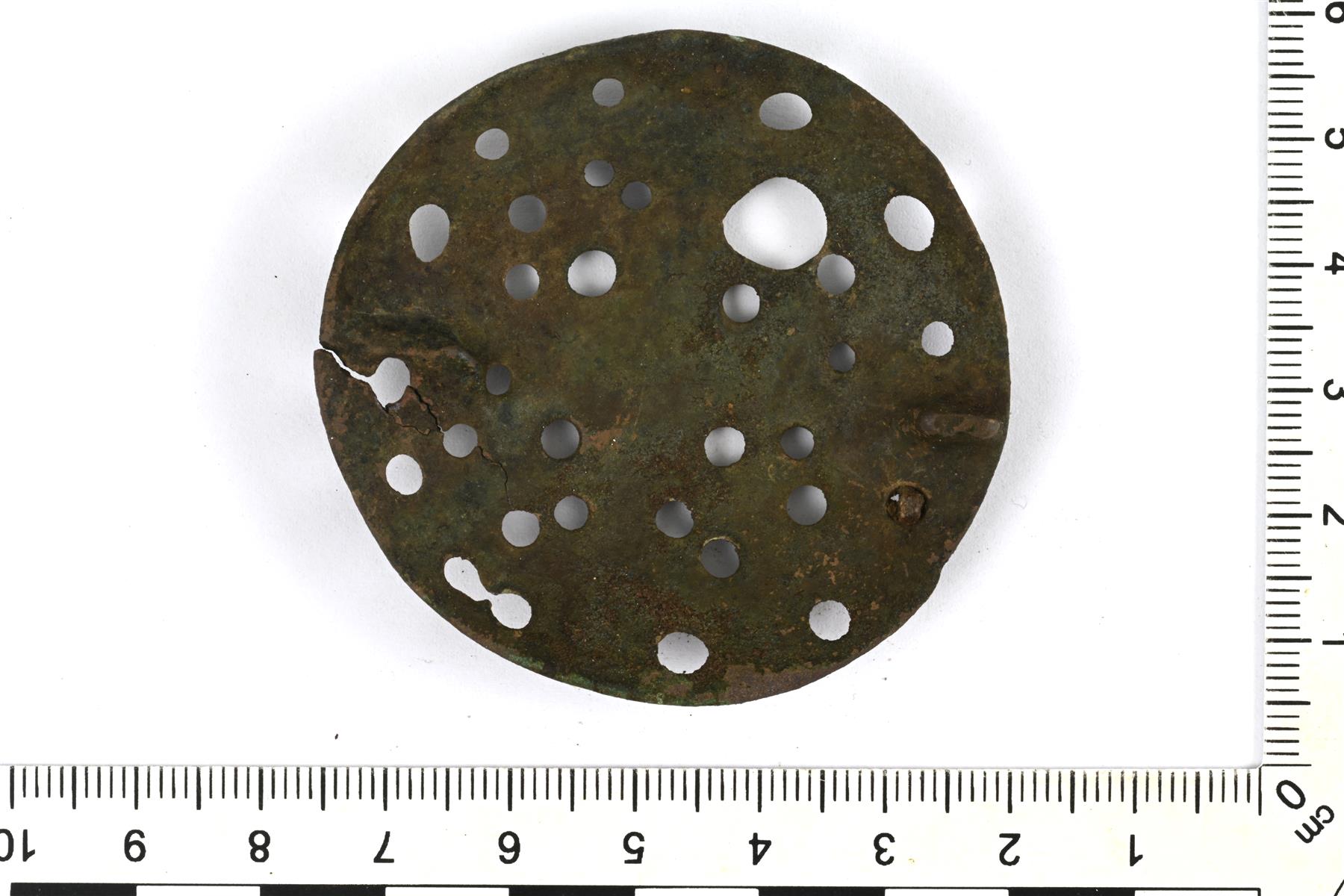 | Hyväkuntoisena säilynyt leijonasolki. Koristeltu pyöreillä reikäkuvioilla, jotka jakavat soljen neljään osaan. Yksi reikä on muita suurempi ja on selkeästi valussa tapahtunut virhe (sula kupariseos ei ole täyttänyt muottia kokonaan). Reunaa kiertää poikkiviivaornamentiikasta muodostuva vyöhyke (erottuu heikosti). Reunassa on pieni reikä, jossa on kupariseoslangan pala (ketjun kiinnityskohta?) Taustapuolen neulakota ja neulan kiinnityslenkki ovat hajonneet. Pelkistetty muoto Kivikosken esittelemästä tyypistä, vrt. Abb. 664. | |
