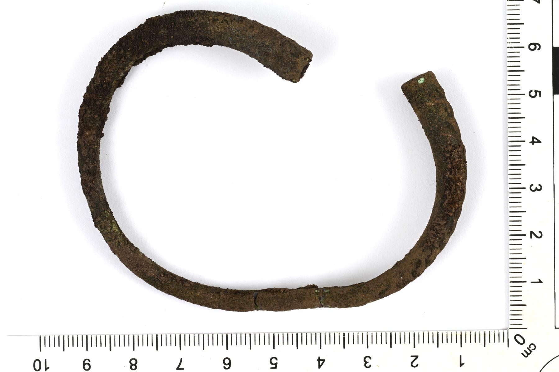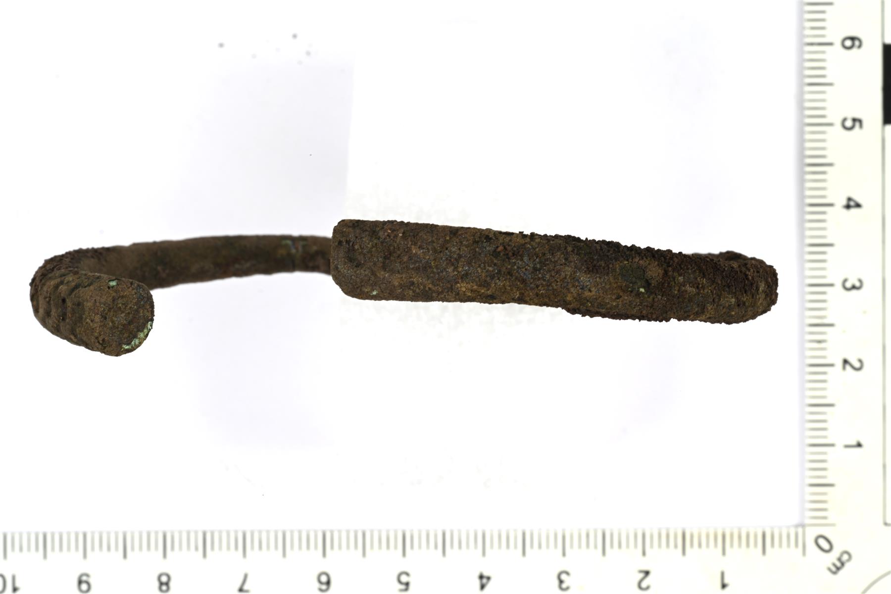 | Päihin levenevä rannerengas. Vartaan poikkileikkaus on kantikkaan pyöreä. Kummassakin päädyssä on koristeluna aaltoviivaornamentiikkaa. Kapein kohta on koristeeton. | |