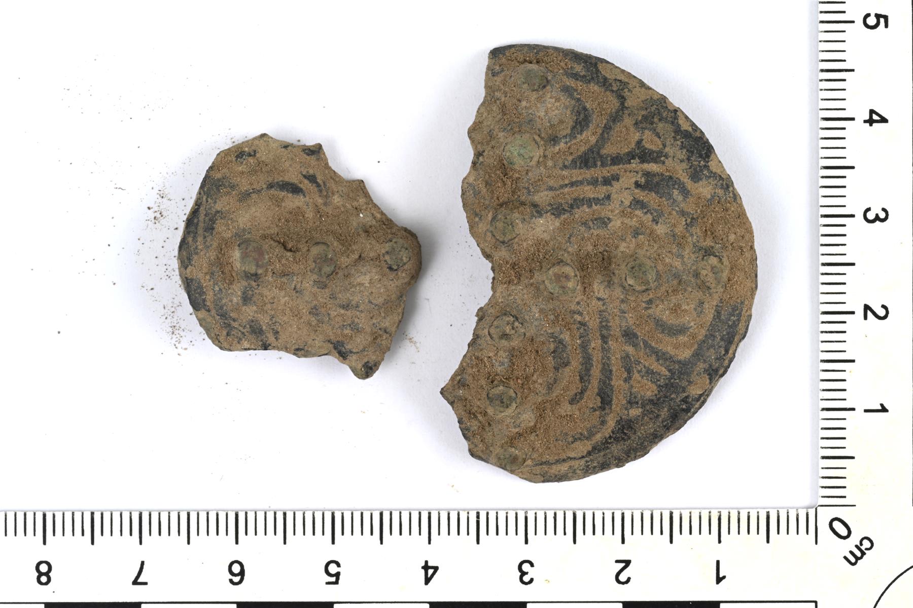 | Pyöreän kupurasoljen katkelmia. Koristeluna tappeja ja viivauurteilla tehtyjä nauhakäärmeitä. Reunus on kapea. Neulakota ja neulan kiinnityslenkki ovat hajonneet. | |