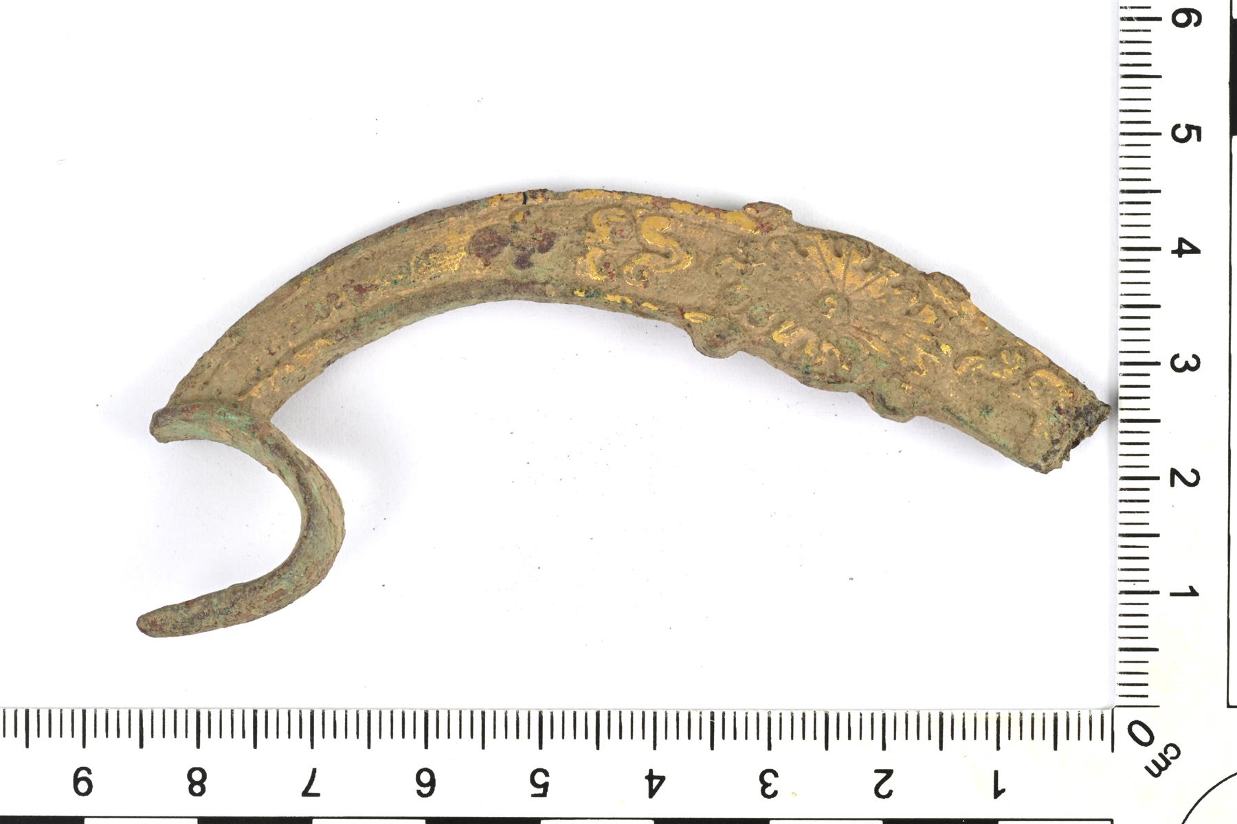 | Pukumiekan väistimen katkelma. Koristeluna ihmishahmo ja kasviornamentiikkaa. Pinnassa on kultauksen jäänteitä. Samasta esineestä kuin : 4 ja : 5. | |