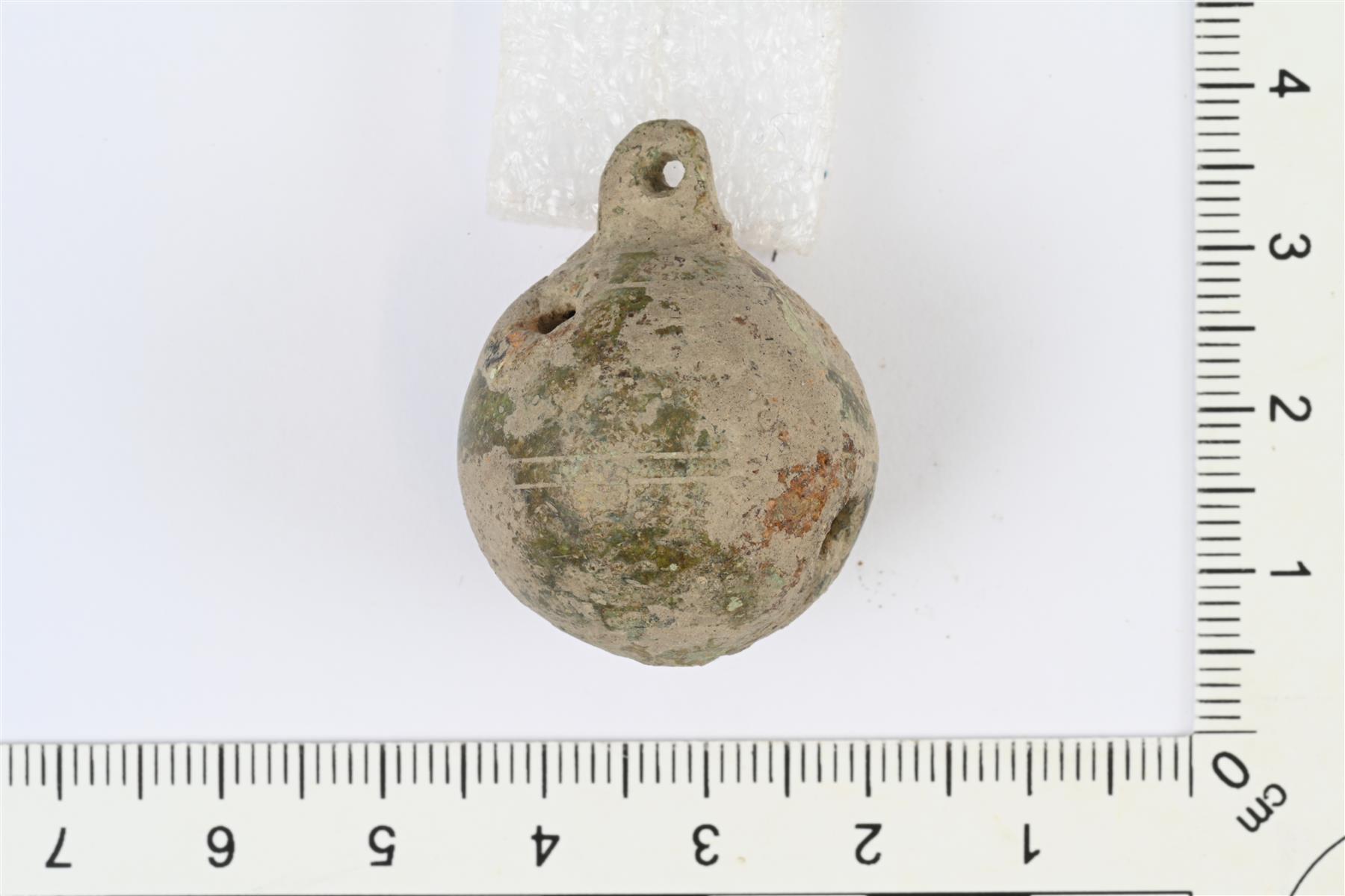 | Valjaskulkunen. Pallomainen, umpinainen, vaipassa kolme pyörää reikää, päällä tukeva valettu ripustuslenkki. Koristeena poikittaisia viivauurteita lenkin alapuolella ja vaipan keskiosassa. Sisällä hely. | |