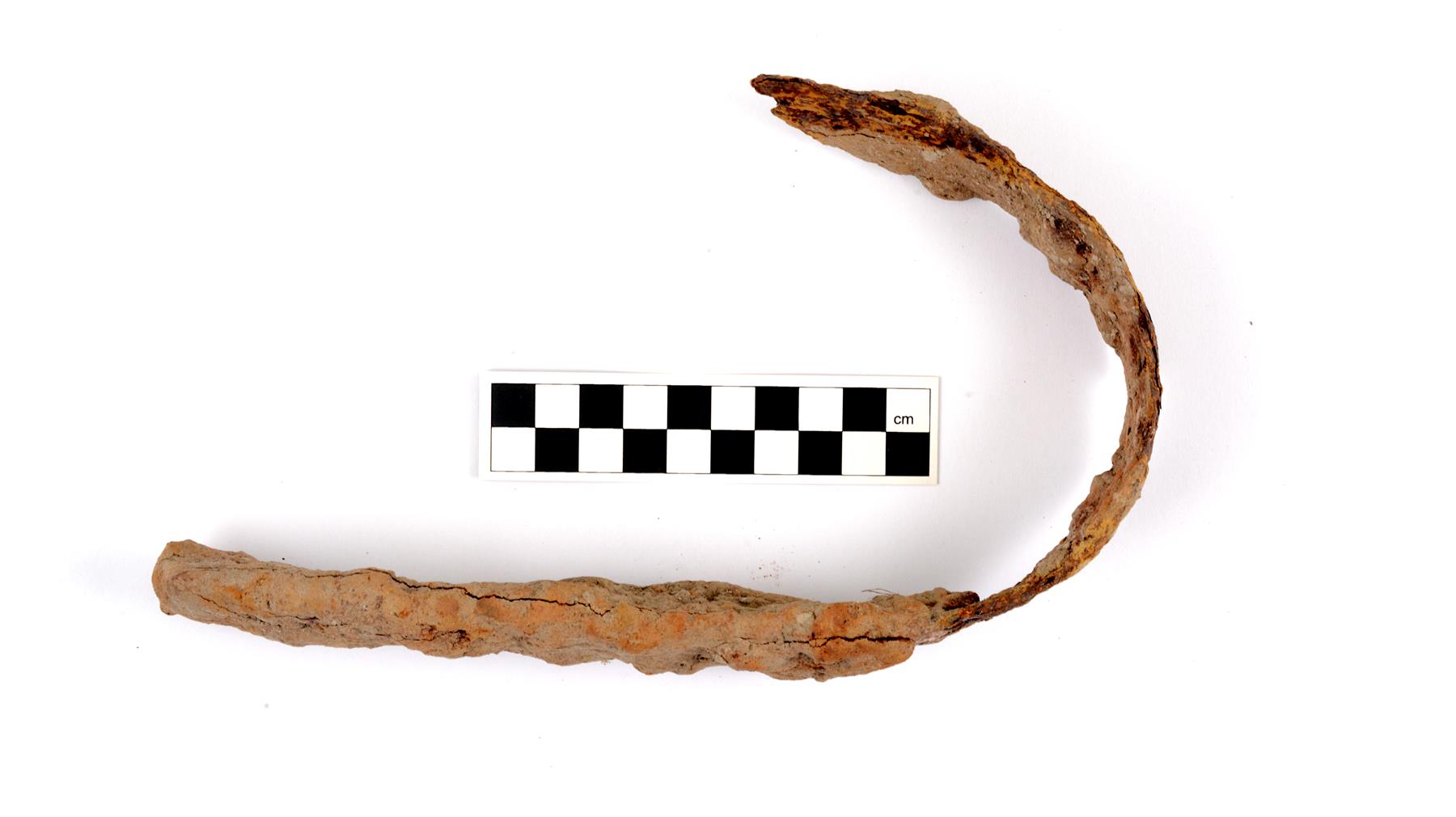 | Todennäköinen miekan säiläkatkelma. Taivutettu mutkalle. Osittain paksun korroosiokerroksen peitossa. | |