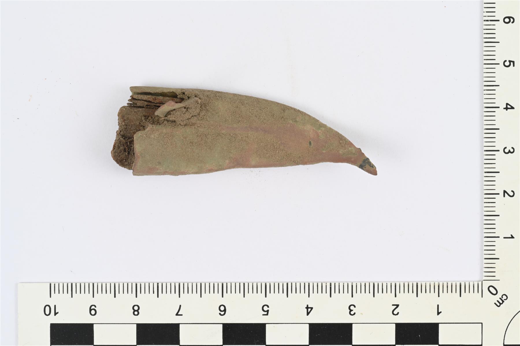 | Kupariseospellistä tehty litteähkö puukontupen kenkäin. Kärki venyy kaarevaksi nipukaksi. Sisällä puuta. | |