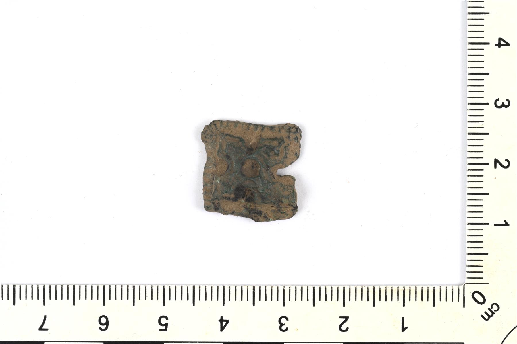 | Vinoristillä koristeltu ruusukehela. Keskellä on reikä niittiä varten. | |