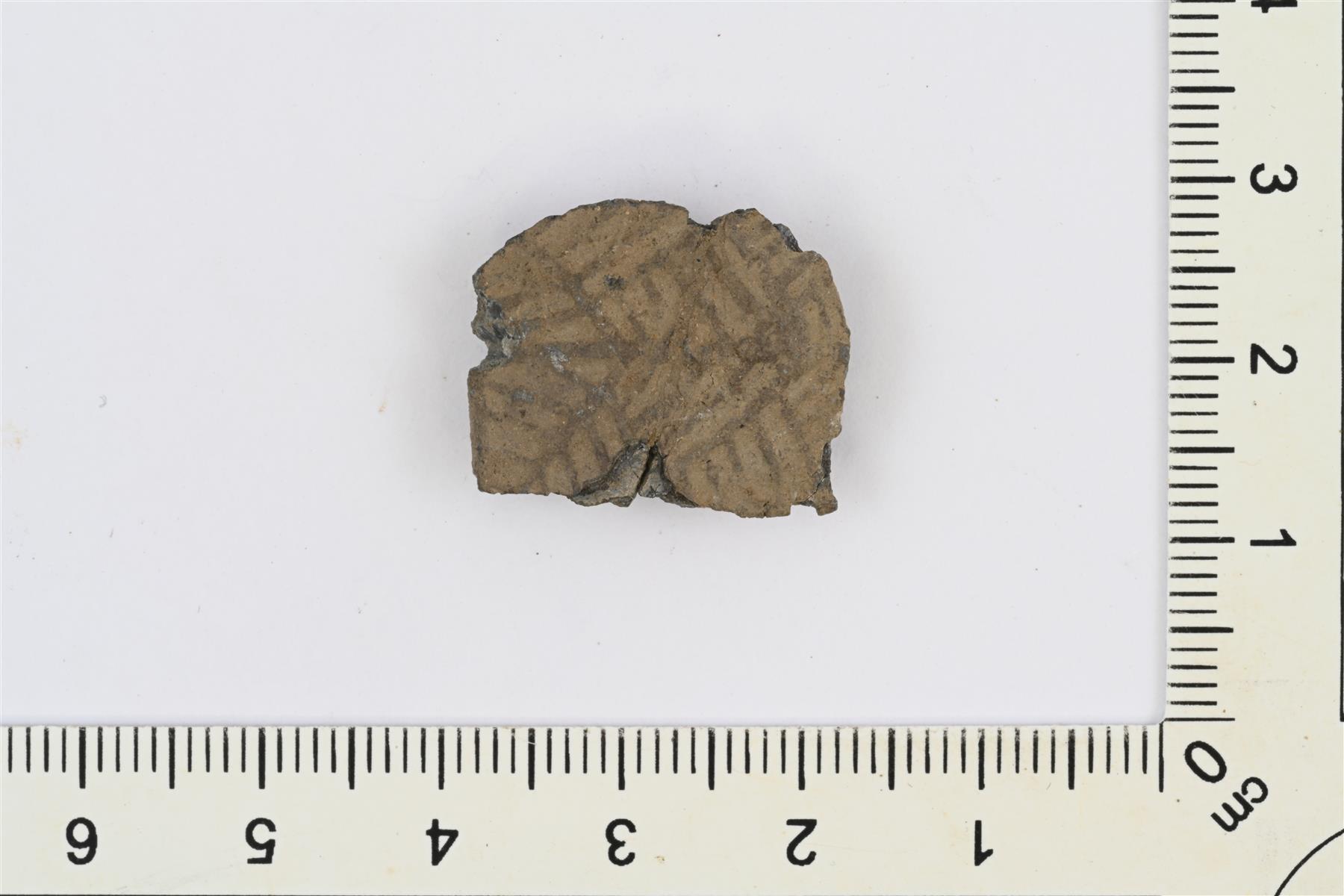 | Vyön- tai hihnanhela. Suorakaiteenmuotoinen, vääntynyt, reunat osittain murtuneet. Etupuolella reliefikoristelua. Taustapuolella kaksi kiinnitystappia. | |