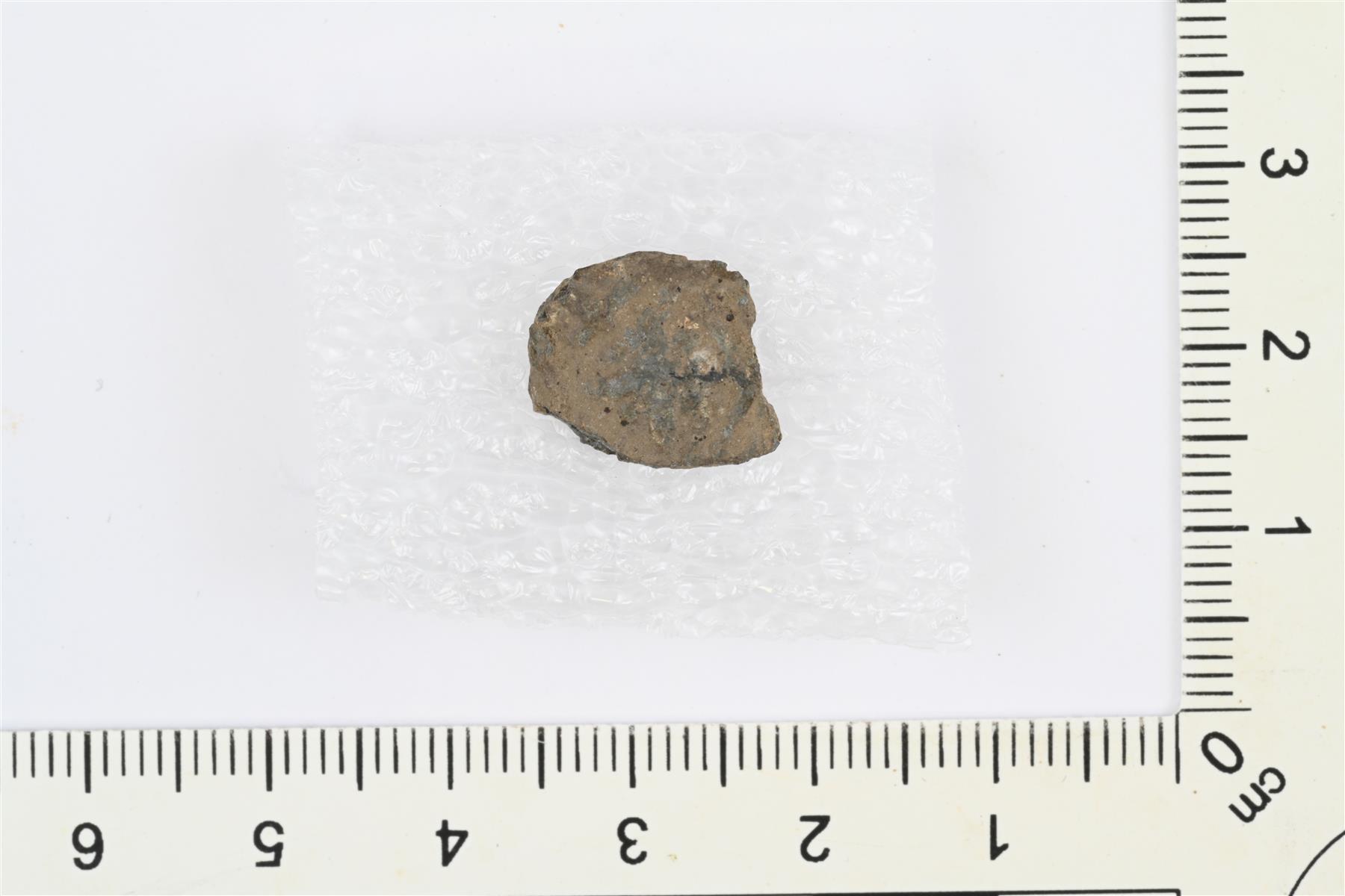 | Vyön- tai hihnanhela, jonka reunat murtuneet. Etupuolella reliefikoristelua, taustapuolella kiinnitystappi. | |
