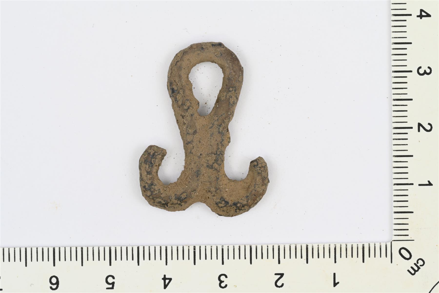 | Katkelma mahdollisesti ketjunkantajasta tai esim. kulkusten kannattimesta tai muusta korusta. Pisaramainen lenkki, jonka sivuilla kaksi murtunutta lenkkiä. | |