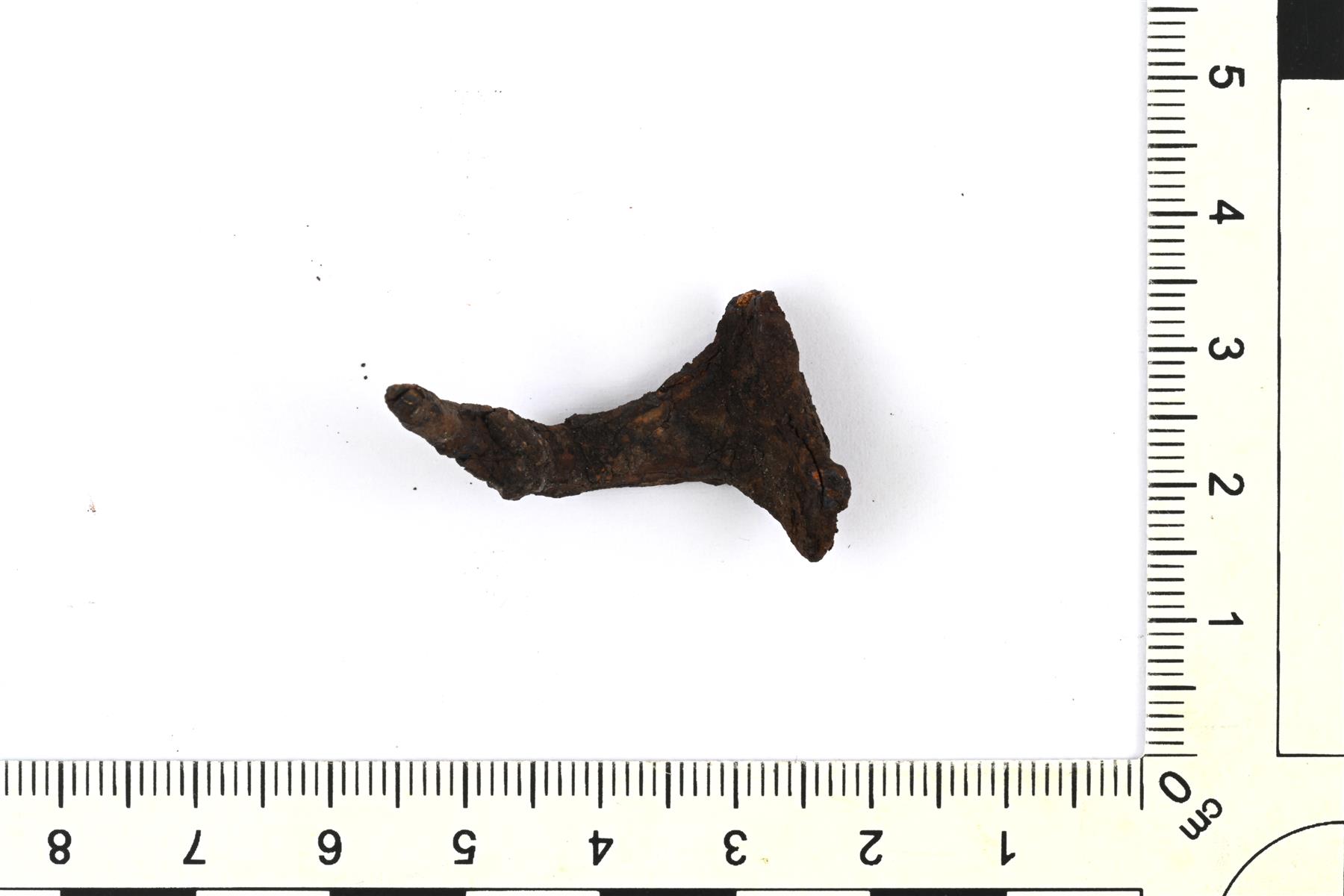 | Ruotonuolenkärjen katkelma. Kaksiteräinen lehti on katkennut läheltä tyveä. Säilynyt osa on taivutettu mutkalle. | |