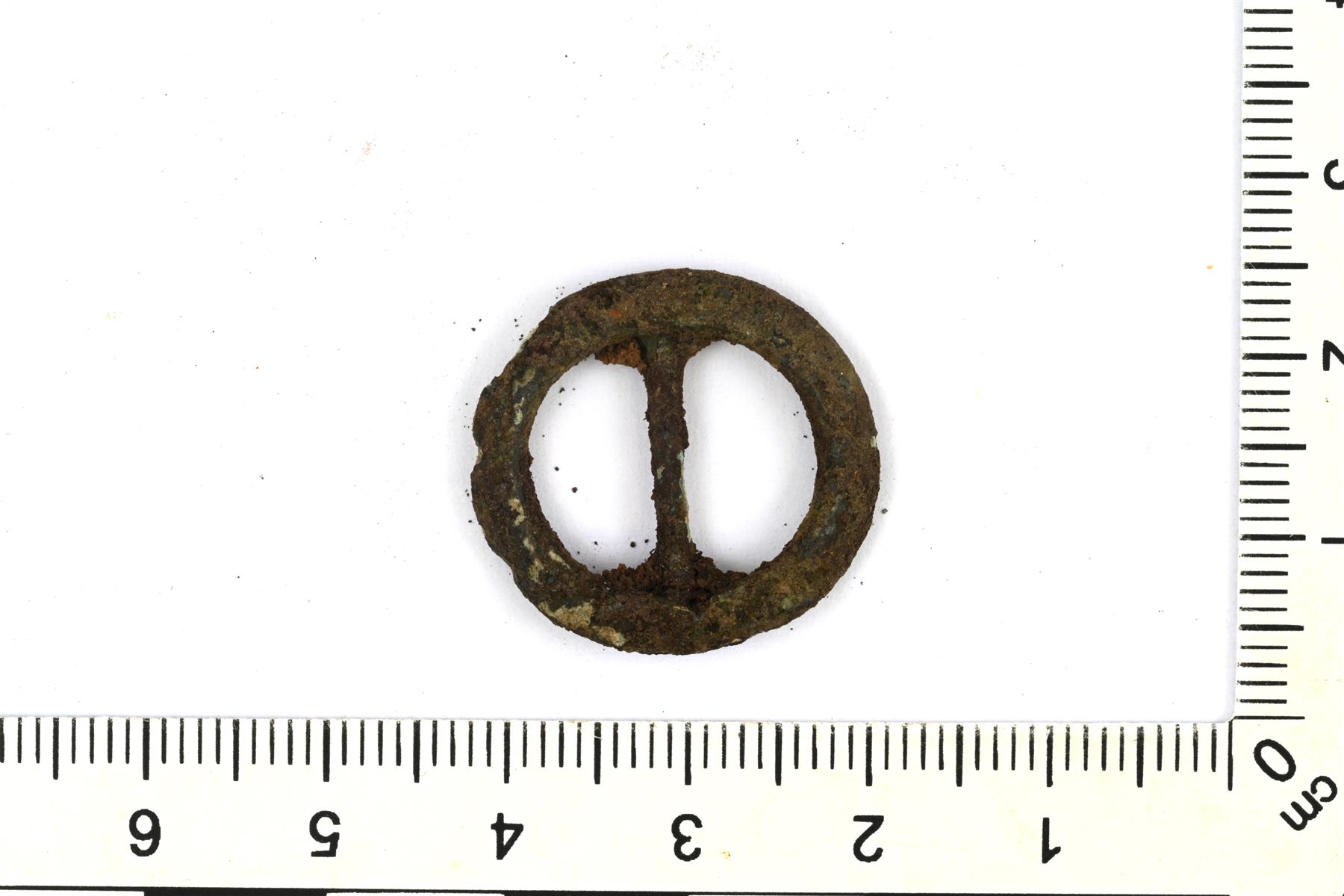 | Pyöreä vyönsolki. Kehän reuna on epätasainen ja voi johtua epäonnistuneesta valusta. | |