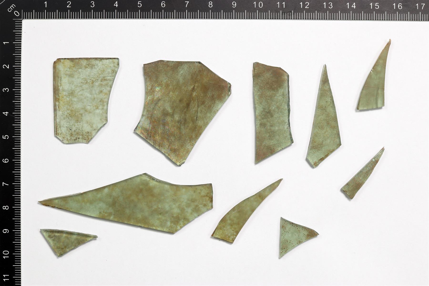 | Vihreää ja paksua ikkunalasia. Joukossa yksi lasiruudun kulmapala, jolla on leikattu reuna. | |