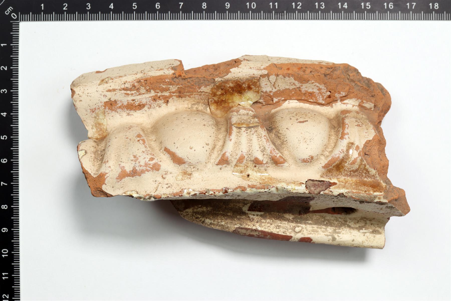 | Profiloidun uunikaakelin katkelma, jossa on kohokoristelua. Pinnalla on valkoista saviliettä ja vihertävä lyijylasite. | |