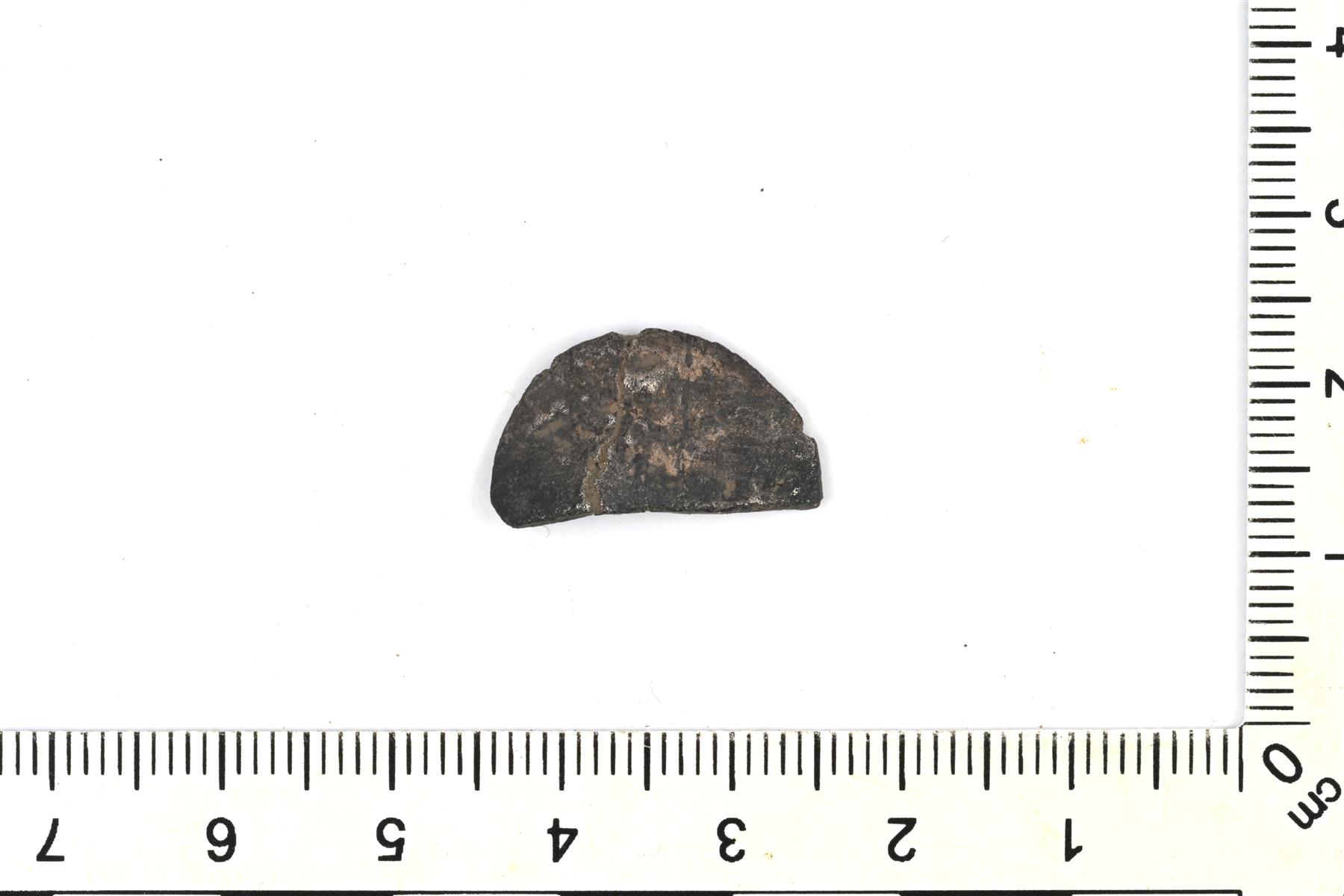 | Mahdollinen hopearahan katkelma. Paksu, lähes kokonaan kulunut, siististi leikattu 1/2 katkelma. | |