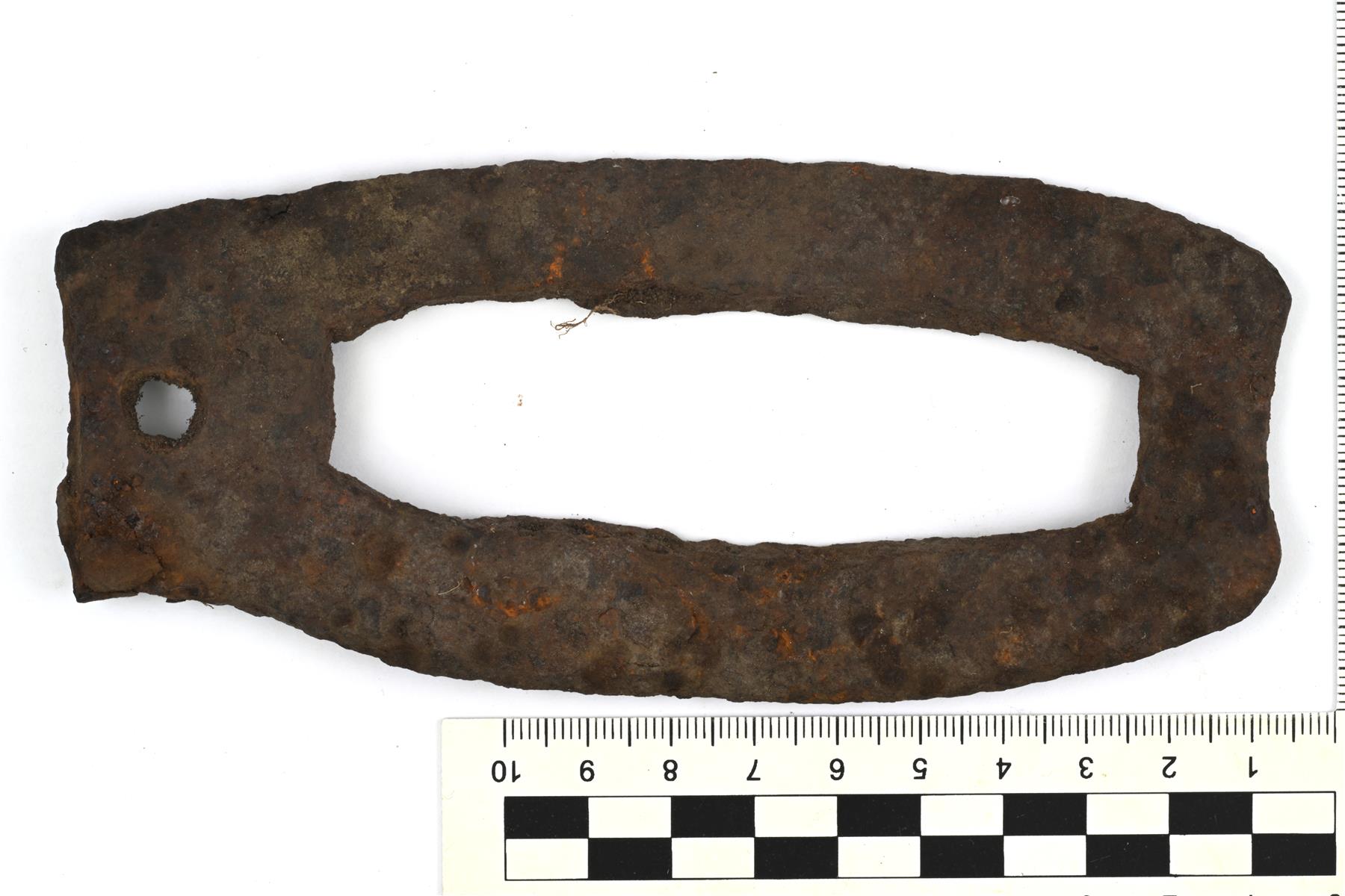 | Suorakaiteenmuotoinen rautaesine. Päädyssä on reikä. Muistuttaa muodoltaan tulusrautaa, mutta on selkeästi kookkaampi ja toiselta puolelta kupera. | |