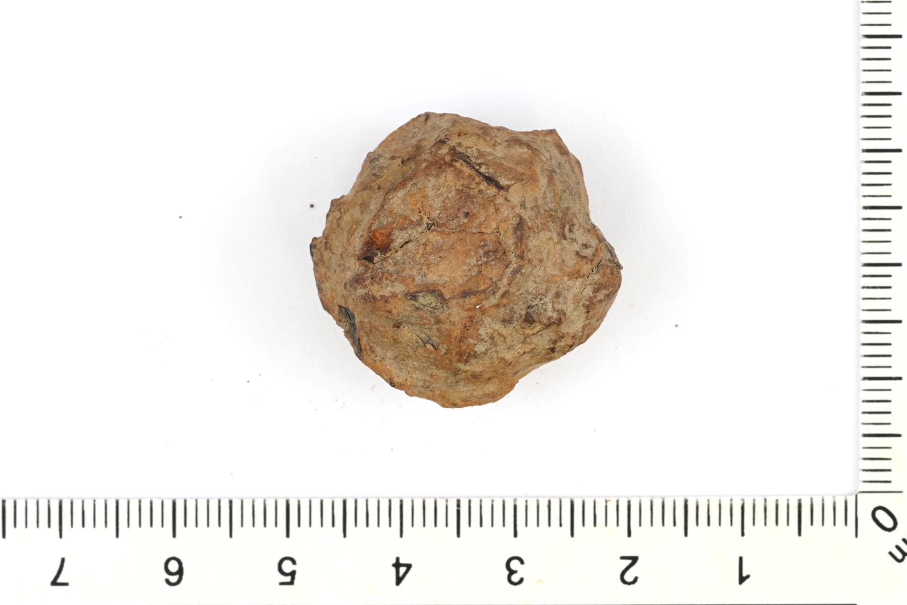 | Navoilta viistetty kuulamainen punnus. Pinnassa on rautaytimen korroosiota. | |
