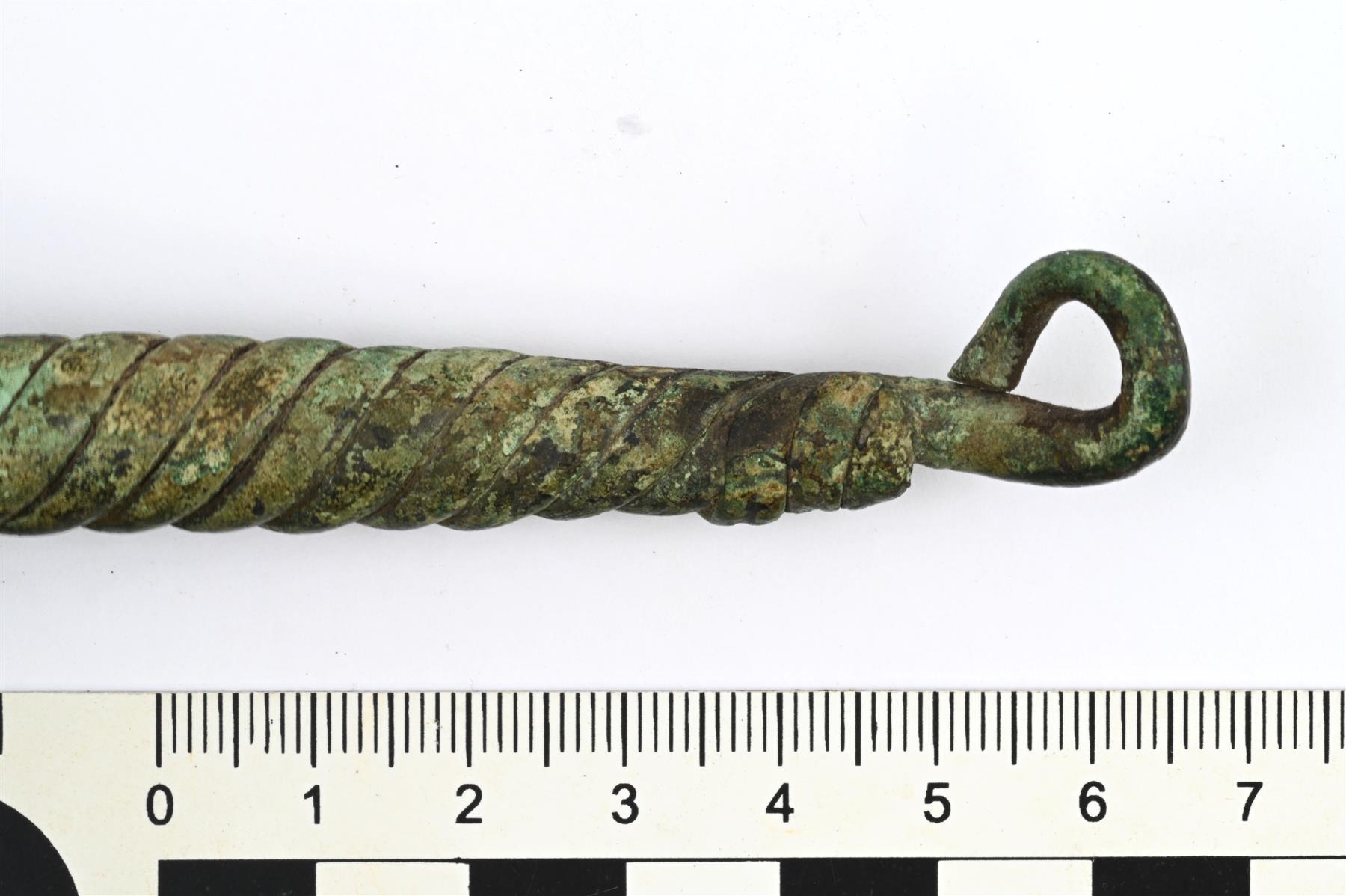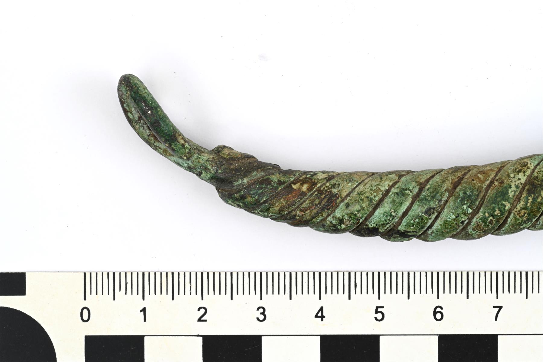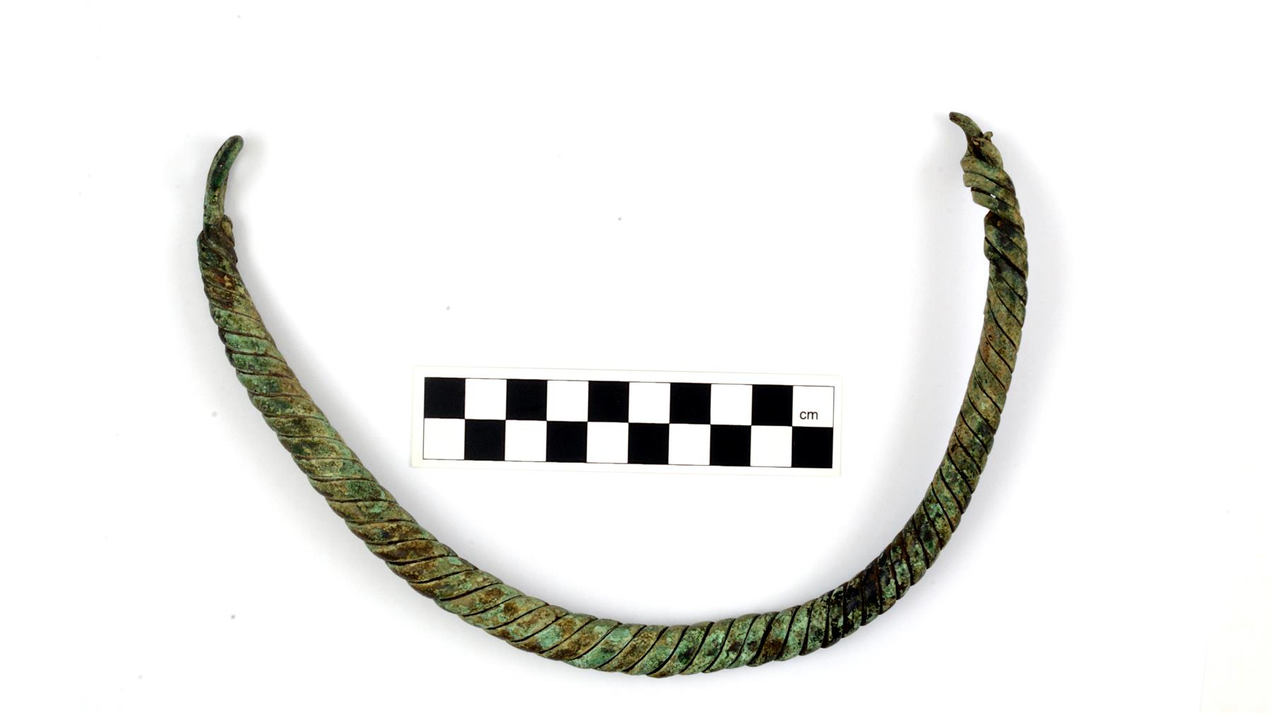 | Neljästä vartaasta kierretyn kaularenkaan katkelma. Keskiosa on hieman paksumpi ja kaularengas ohenee tasaisesti päätyjä kohti. Ehjässä päädyssä yksi vartaista on kierretty lenkiksi ja kolme muuta on taottu sen tyviosan ympärille. Vrt. Kivikoski Abb. 727. | |