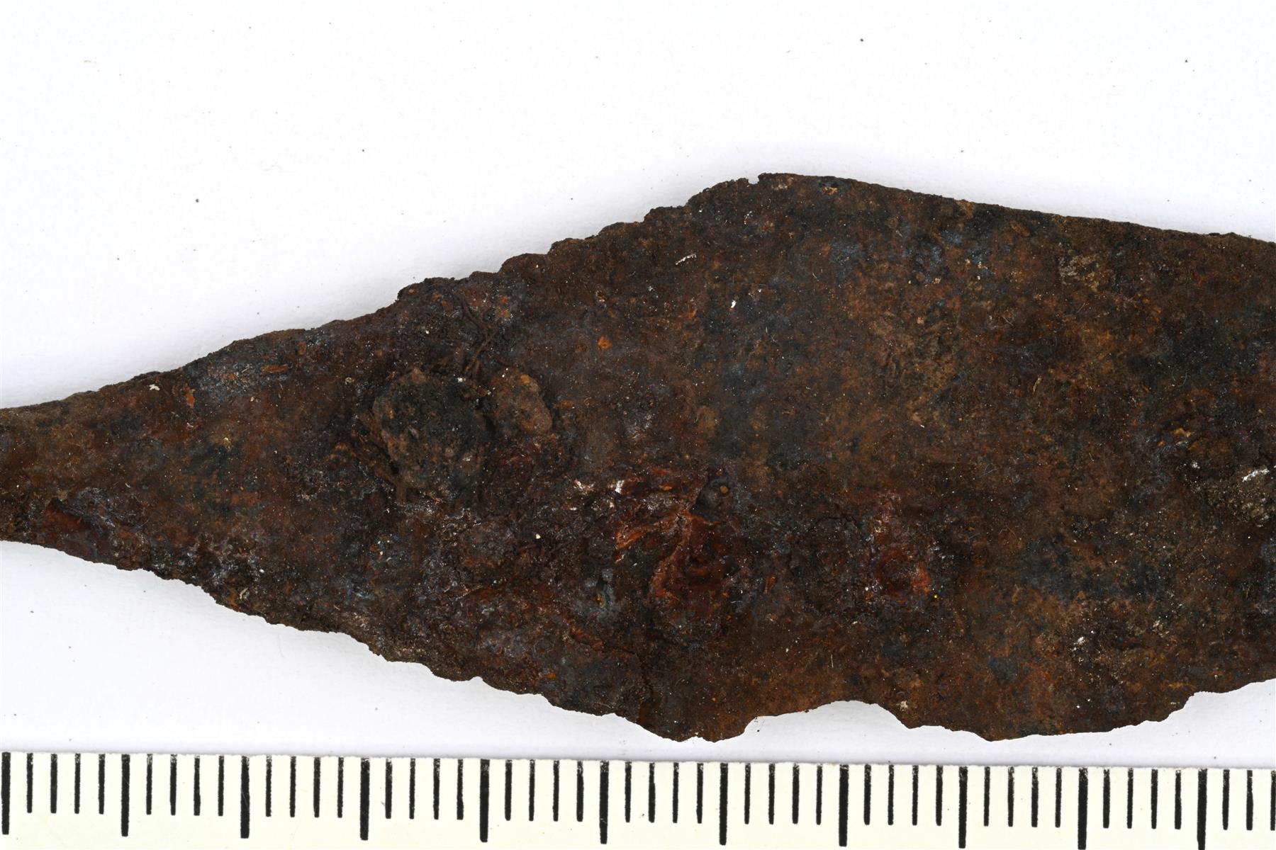 | Kaksiteräinen ruotonuolenkärki. Lehden levein osa on lähellä tyveä ja poikkileikkaus on muodoltaan litteä vinoneliö. Teränsuut ovat melko suorat, toisen teränsuun alaosassa on sahalaitakuviontia, joka kuitenkin voi olla ruosteen aiheuttamaa. Ruoto on poikkileikkaukseltaan vinoneliö ja se kapenee piikiksi. Hiekkasen luokittelujärjestelmässä nuolenkärjen tyyppi on 3DVII, jolle ei ole vastineita Hiekkasen julkaisussa. | |