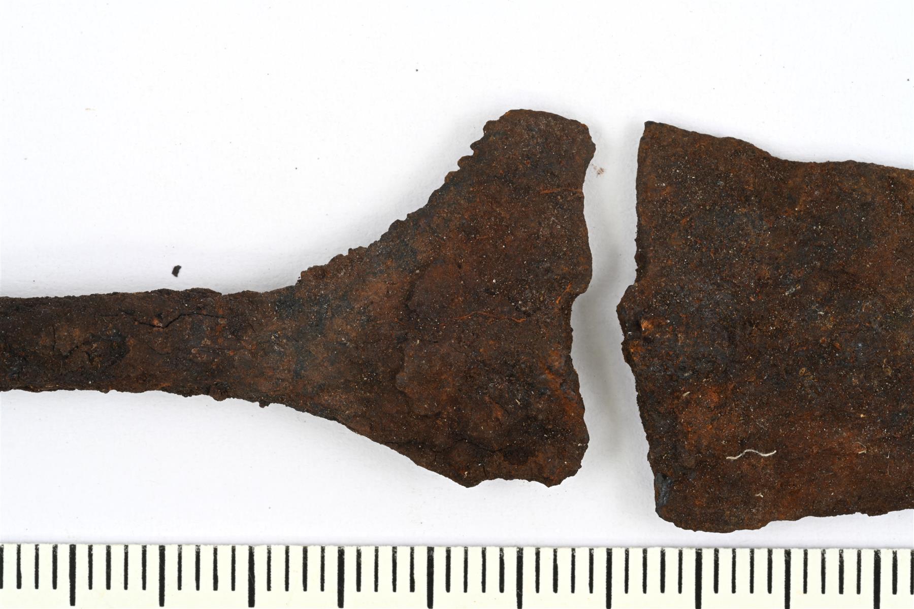| Kahteen osaan hajonnut kaksiteräinen ruotonuolenkärki. Lehden levein kohta on lähellä tyveä. Lehti on poikkileikkaukseltaan litteä vinoneliö ja keskiosassa on hyvin matala kohoharja. Teränsuut ovat melko suorat, mutta tyvessä ne ovat hieman koverat ja toisella puolella reunassa on sahalaita. Ruoto on poikkileikkaukseltaan pyöreähkö ja se kapenee kärkeä kohti. Hiekkasen luokittelujärjestelmässä muoto on 3EVI, jolle ei ole vastineita Hiekkasen teoksessa. | |