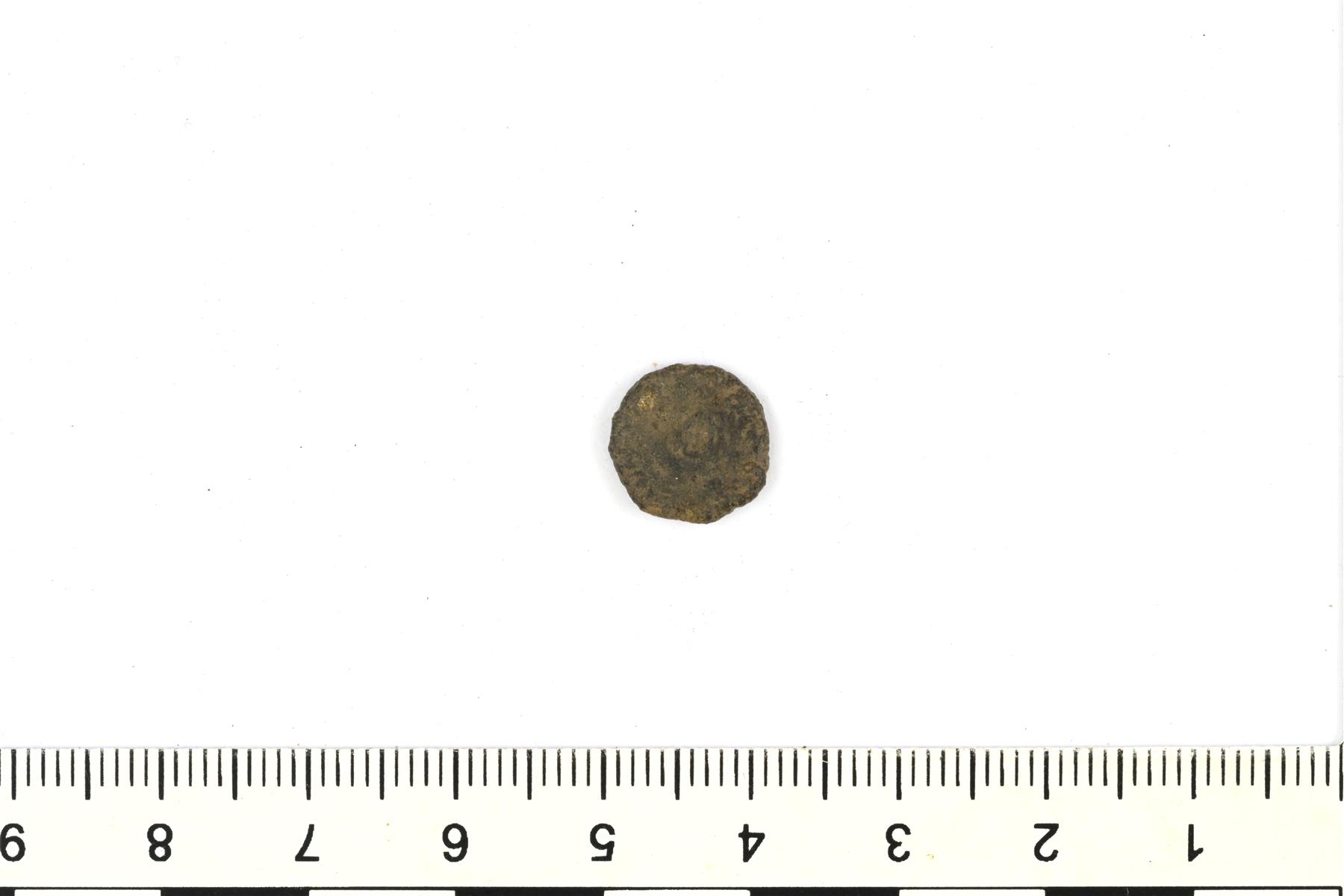 | Pahoin kulunut kuparilevy. Mahdollisesti kolikko, mutta pinta on täysin tuhoutunut. | |