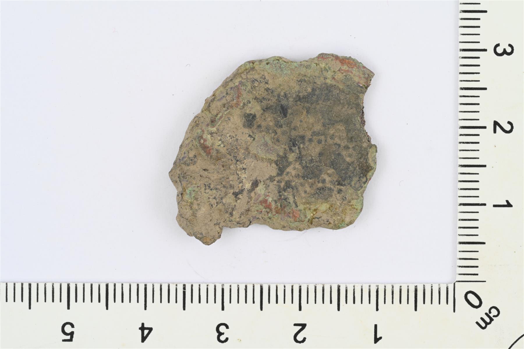 | Osittain sulanut massiivisen rannerenkaan katkelma. Etupuolella leimakoristelua. | |