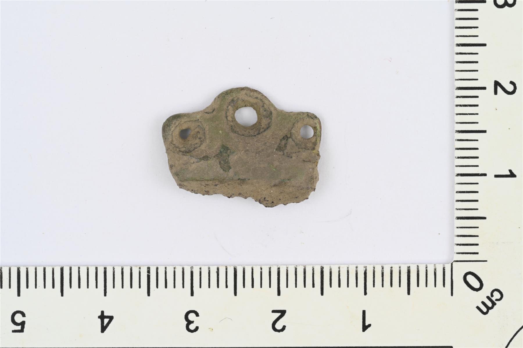 | Pöytäveitsen päätehela. Päädyssä keskellä pyöreä uloke, siinä ja sen molemmin puoli pyöreät reiät. | |