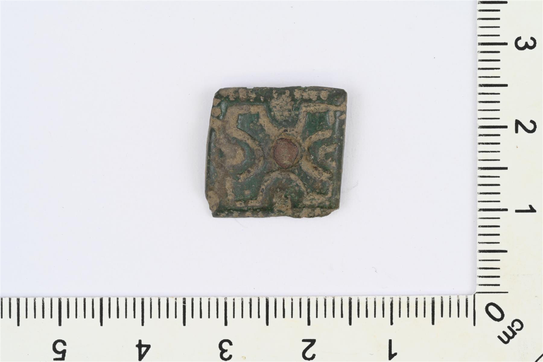 | Nelikulmainen vyön- tai hihnanhela. Reliefikoristeluna vinoristi. Keskellä niitti. | |
