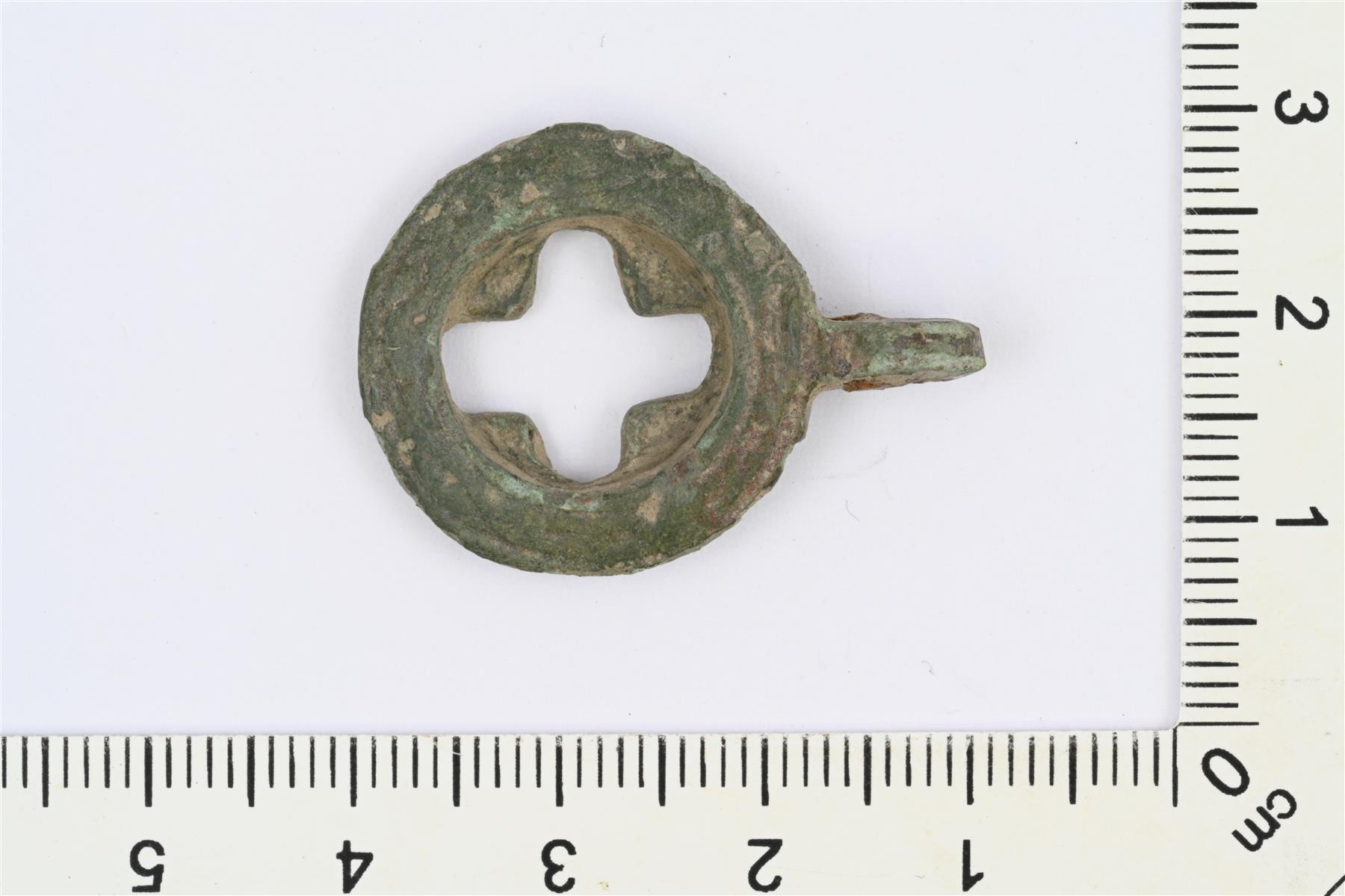 | Riipus tai mahdollisesti nappilukkoisen vyönsoljen osa. Pyöreä, reunassa lenkki. Keskellä tasavartisen ristin muotoinen reikä. Etupuolella reunassa koristelua. | |