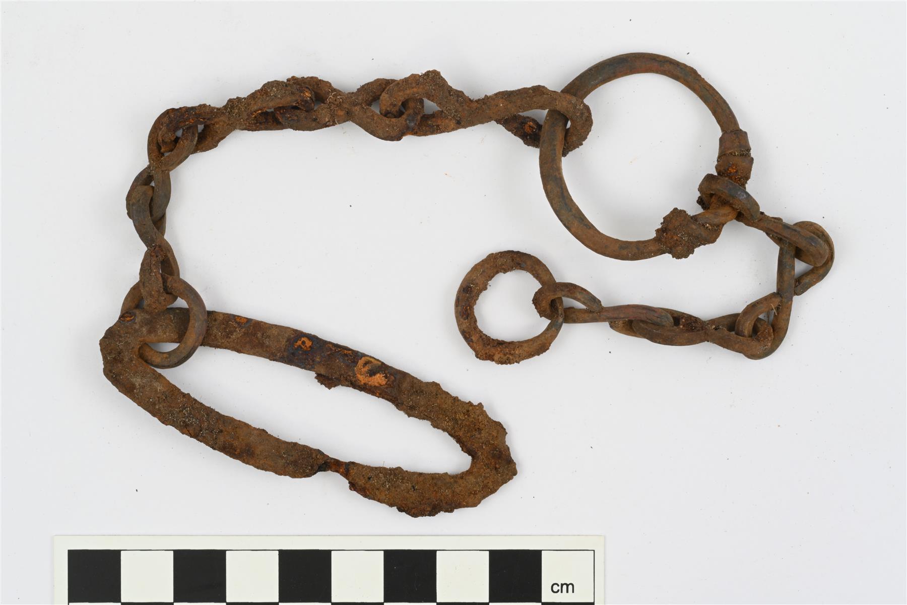 | Soikea tulusrauta, joka kiinni rautaketjussa. Ketju koostuu kahdeksikon muotoisista lenkeistä, joiden pituus 24-40 mm. Kahden ketjunpätkän välissä vartaasta kierretty rautarengas. Ketjun päissä pienemmät renkaat, joista toinen liitetty tulusrautaan. | |