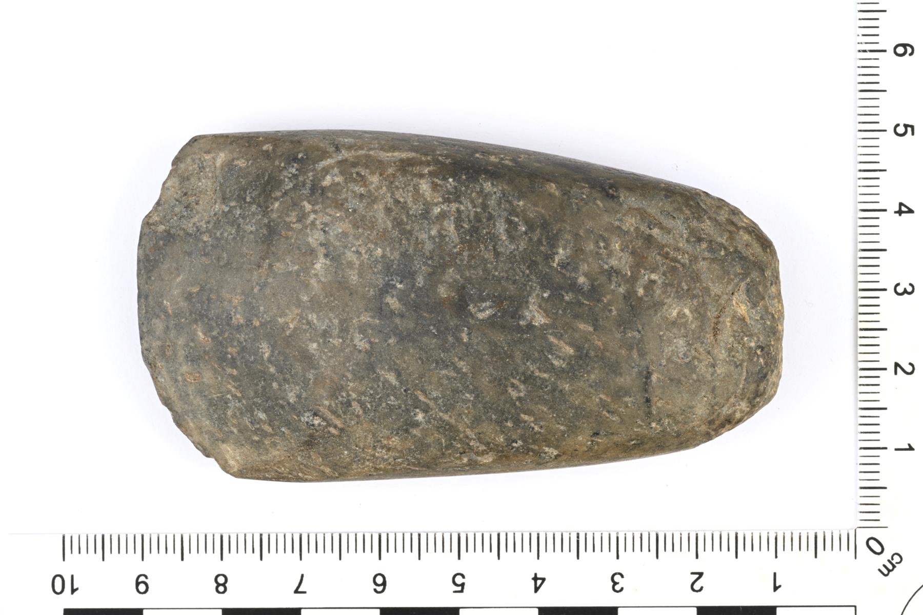 | Lähes kauttaaltaan hiottu kivikirves. Teränsuu on epäsymmetrinen. Kannassa on raakatyöstön jälkiä. Vrt. Luho kuva 83. | |
