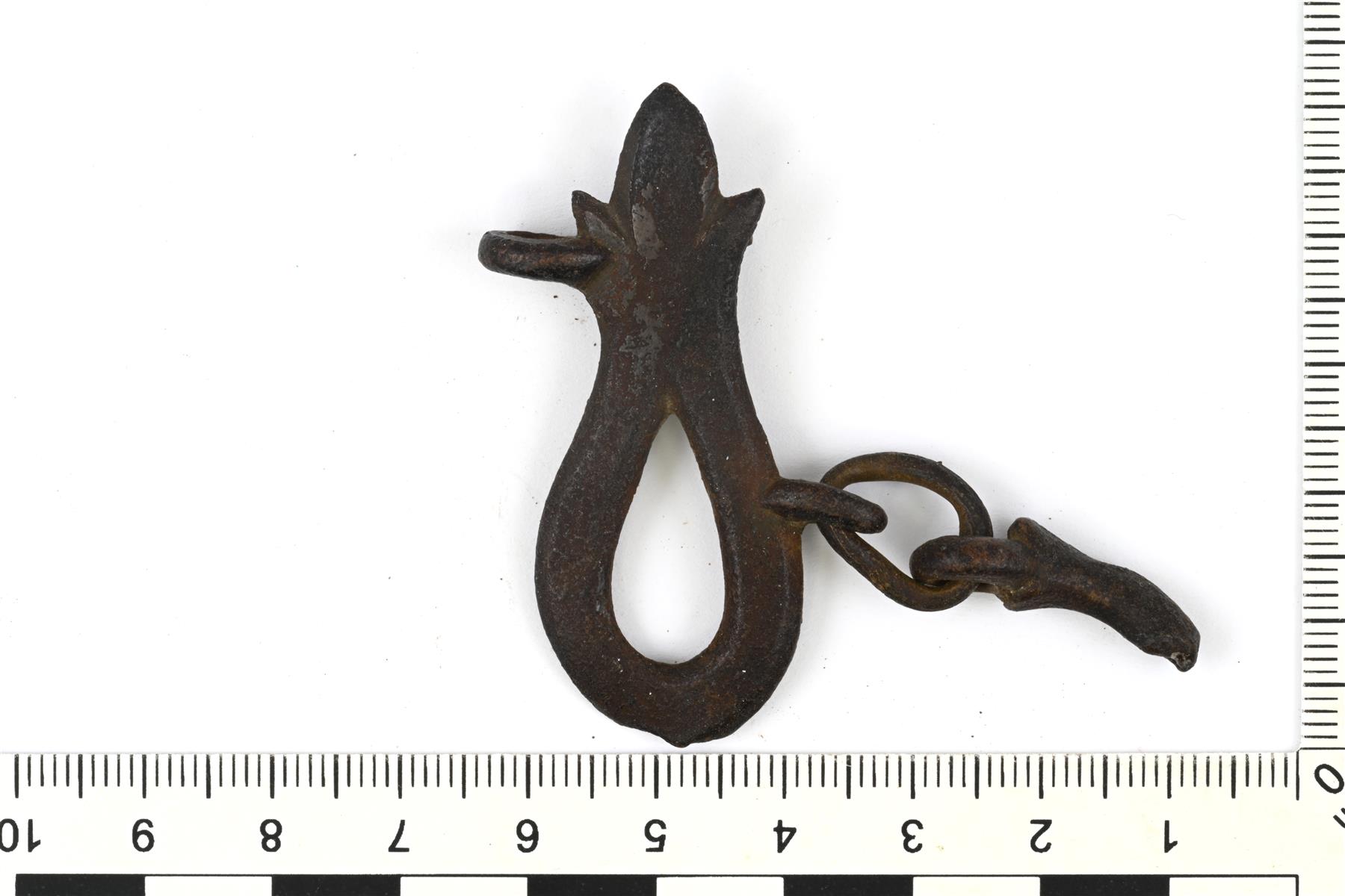 | Mahdollinen valjaiden koristeosa. Muodoltaan lilja-aiheinen. Sivuilla on korvakkeet, joissa toisessa on riipuksen pala. | |