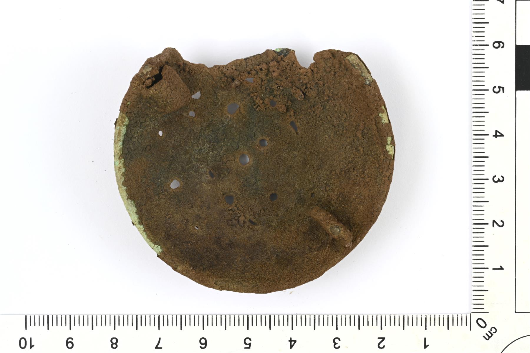 | Kaksieläiminen pyöreä kupurasolki, jonka reunasta on hajonnut palanen. Koristeluna viivauurteilla tehtyjä nauhakäärmeitä ja reikäkuviointia. Taustapuolella on neulan kiinnityslenkki ja neulakota. Pinnassa on hauras patinakerros. | |