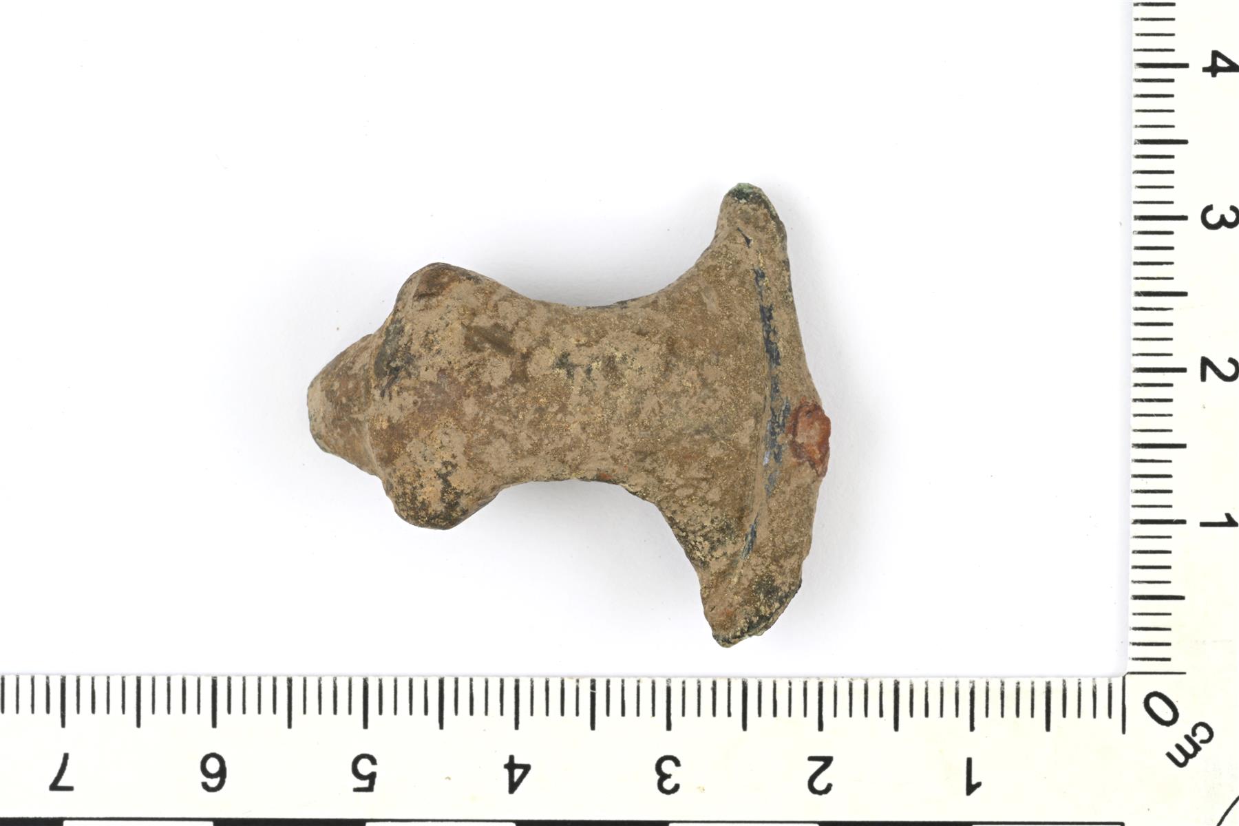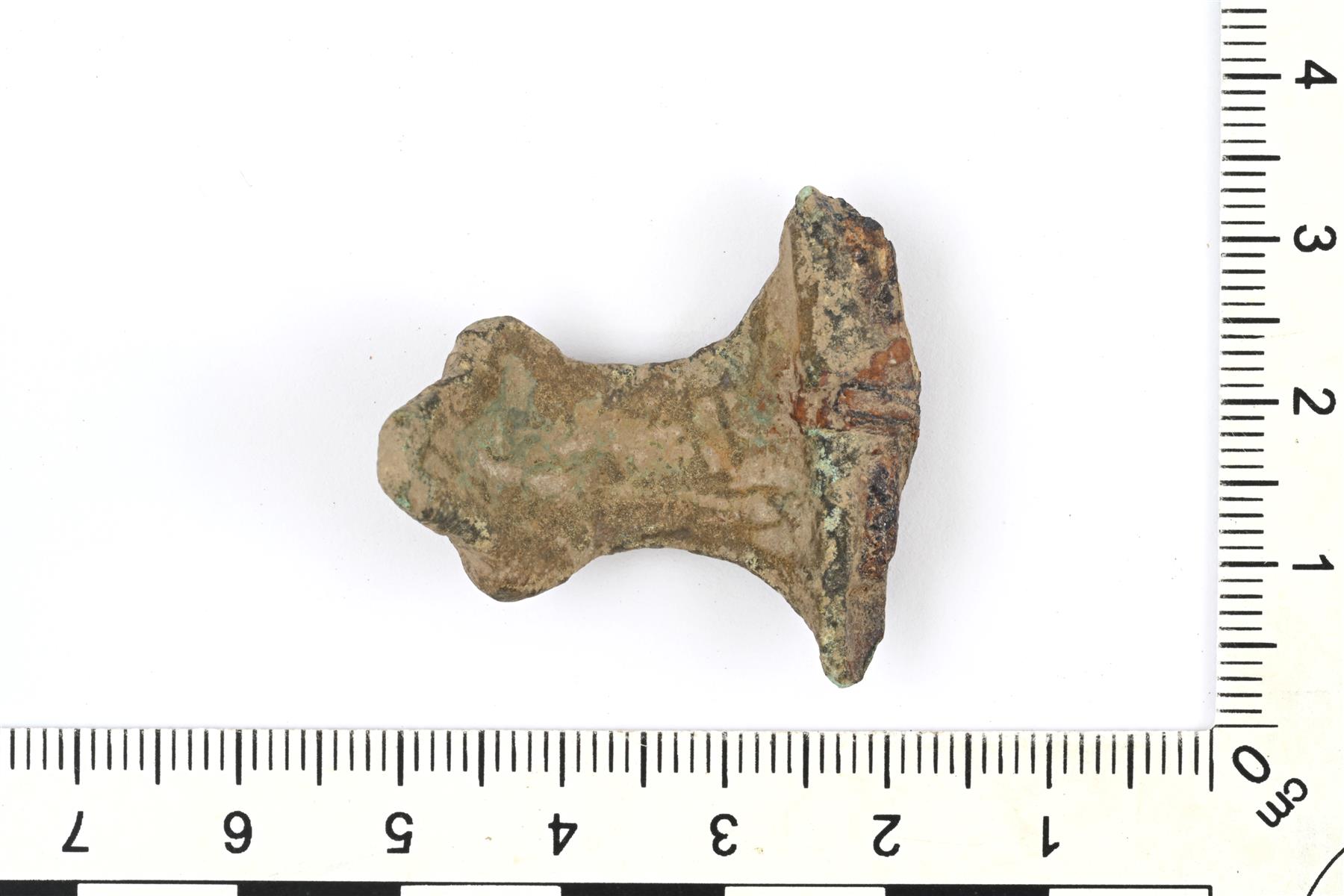 | Oksasoljen pään ja kaaren katkelma. Päädyn ja kaaren poikittaiset palkit ("oksat") ovat hajonneet. Päädyssä on rikkoutunut akselihylsy, jonka sisäpuolelta on paljastunut rautainen akseli. Rautaisesta neulasta on säilynyt hieman korroosiopintaa. Vastaa lähinnä liivinmaalaisia oksasolkia, joista Suomessa samantapainen akselihylsy on Salon Uskelan Ketohaka 2:n soljessa (KM 6658: 20). Vrt. Keskitalo 1979: 186-187, kuvat 98-100. | |