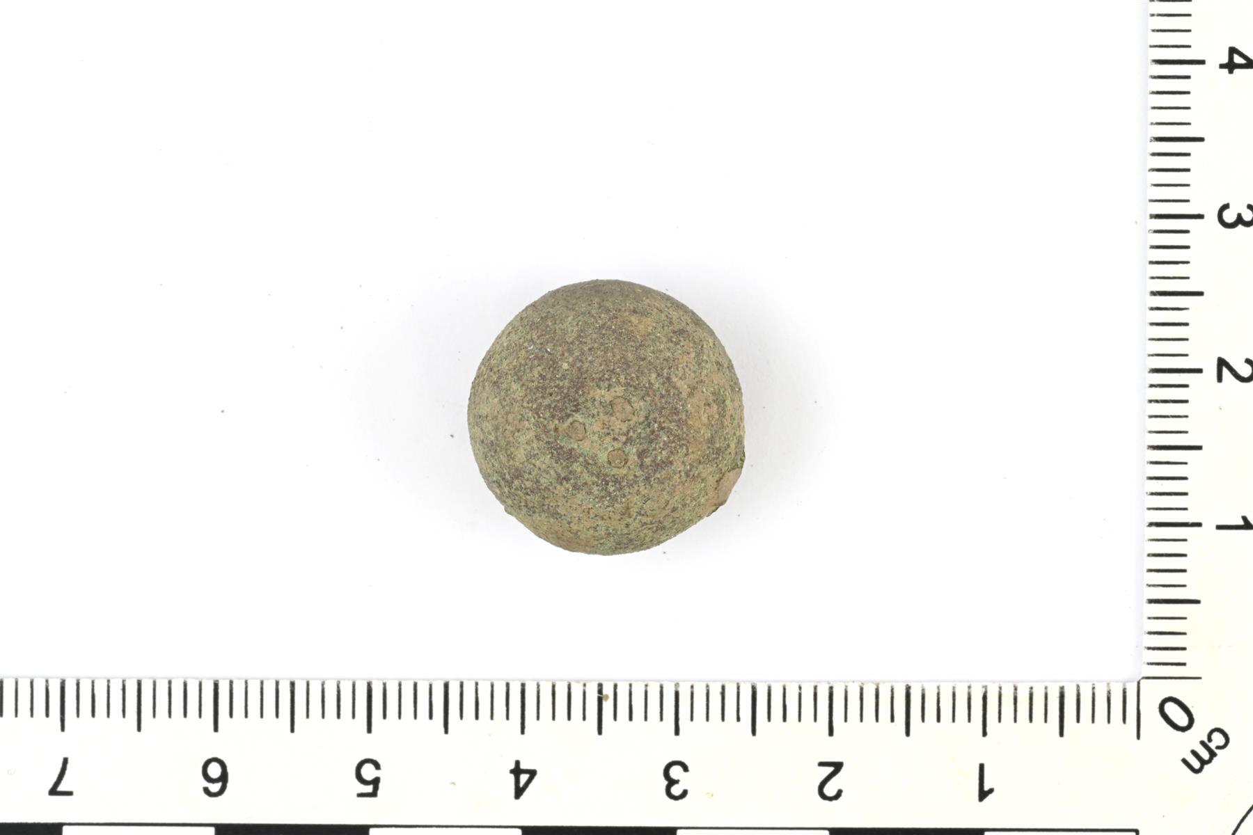 | Navoilta viistetty kuulamainen punnus. Pinta on pahoin kulunut, mutta koristelusta erottuu häränsilmäleimoja. Napojen halkaisijat: 7,6 ja 6,6 mm. Ei magneettinen. | |