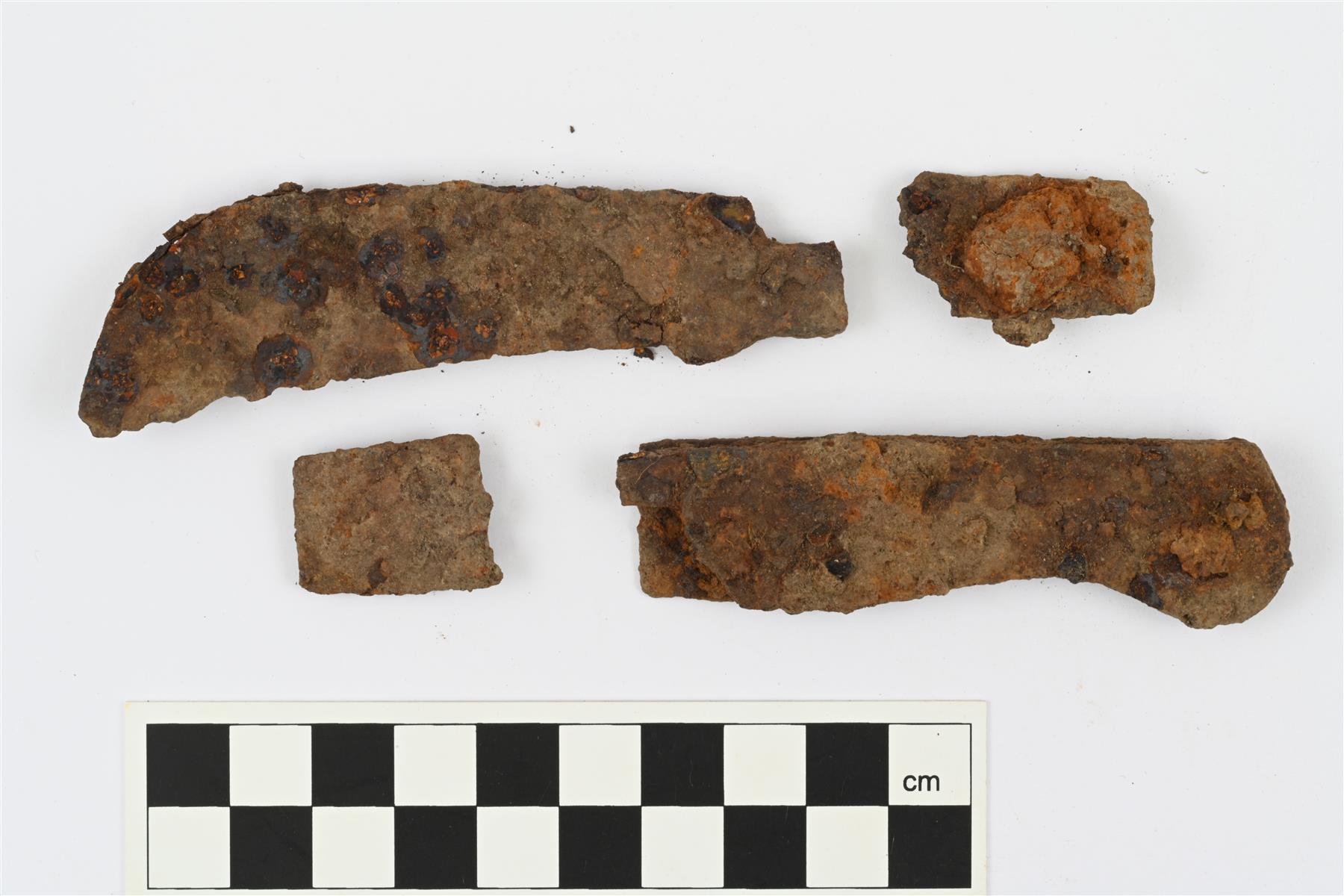 | Katkelmia luultavasti kääntöveitsestä. Terän hamara kupera ja teränsuu hieman kovera. Kahvassa kaksi rautalevyä, jotka kiinnitetty toisiinsa kahdella niitillä, niittien päät ovat voimakkaasti esillä kahvan molemmin puolin. | |