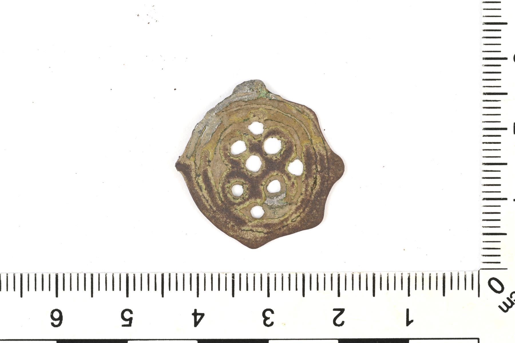 | Pyöreä osmansolmuriipus. Koristeluna reikäkuviointia. Ripustuslenkki on hajonnut. | |
