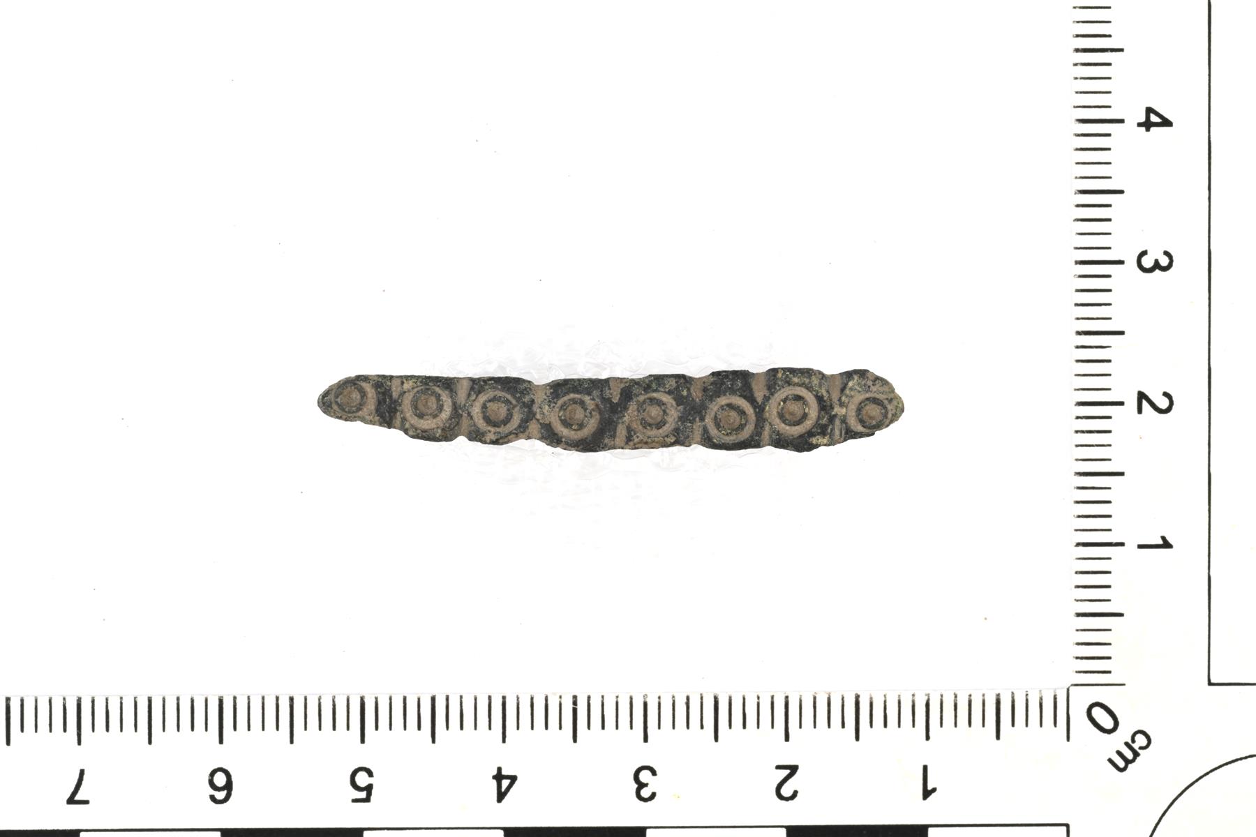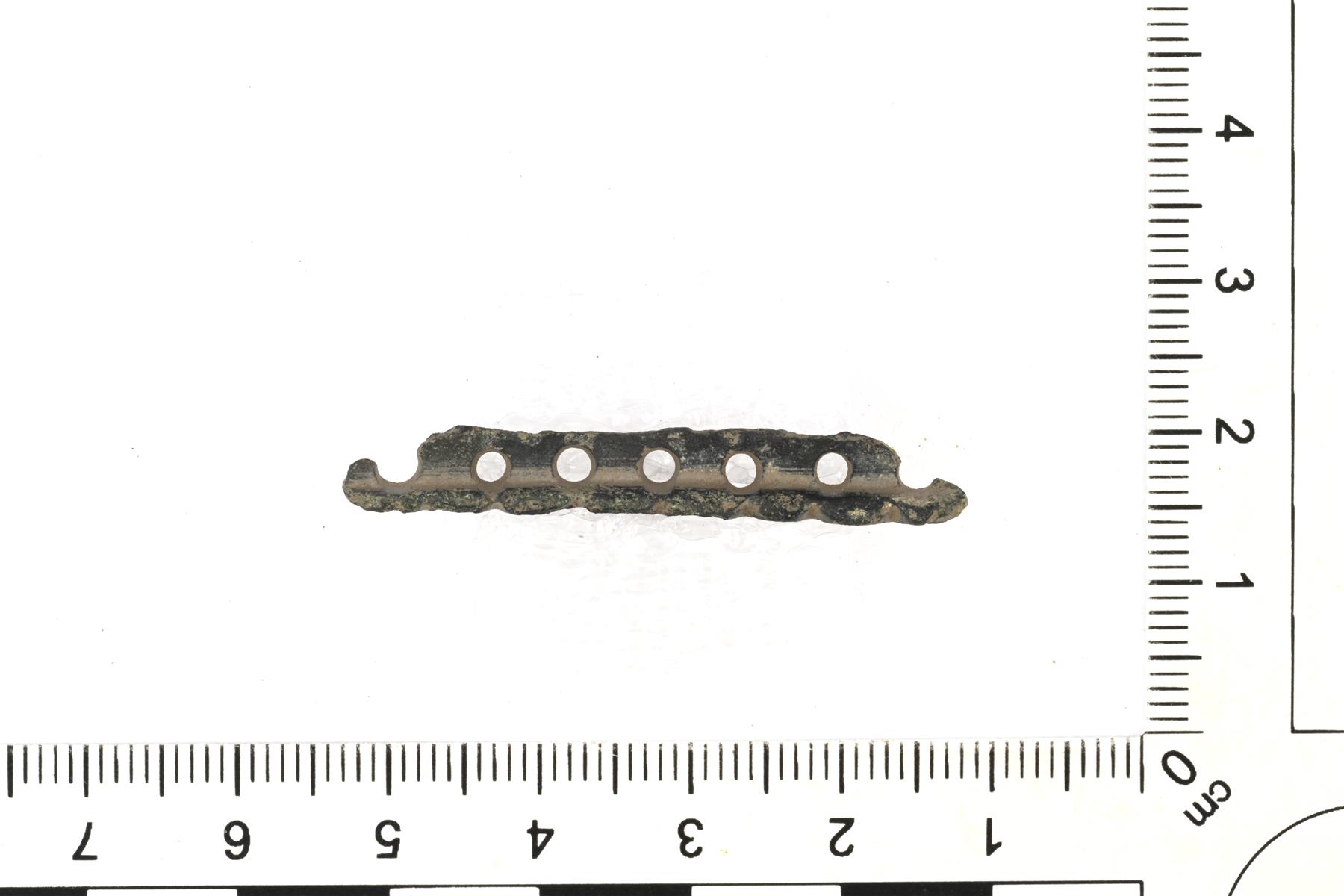 | Suorakaiteenmuotoinen ketjunjakaja. Etupuolella on koristeluna vinoneliöiden muodostama kenttä ja häränsilmäleimoja. Taustapuolella on poikittainen levy, jossa on viisi ehjää ja kaksi rikkoutunutta reikää ketjujen kiinnitystä varten. | |