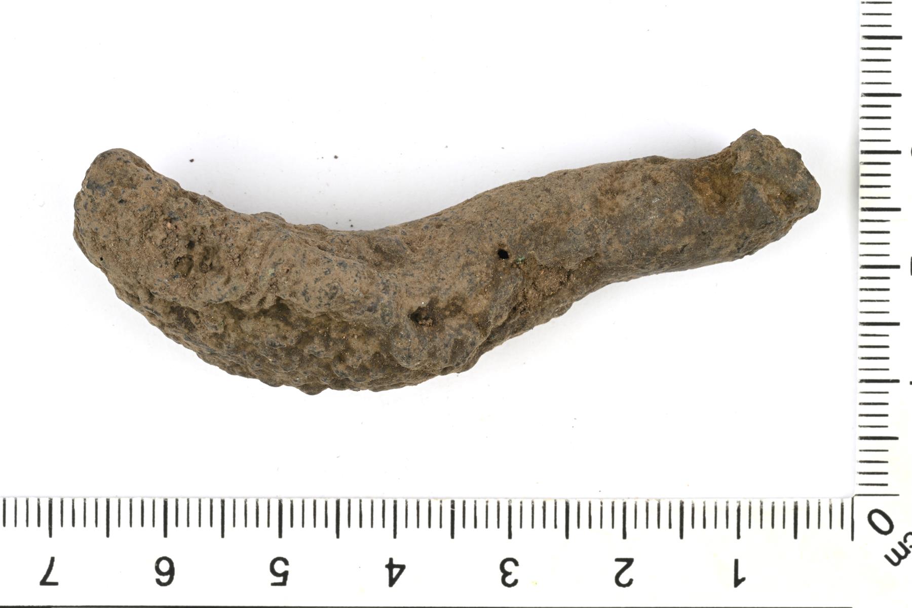 | Pahoin sulaneen kupariseosvartaan palanen. Todennäköisesti kaularenkaan katkelma. | |