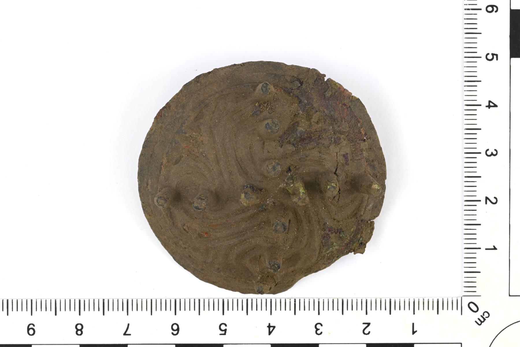 | Melko hyväkuntoisena säilynyt F-tyypin solki. Koristeluna kaksitoista tappia ja viivauurteilla tehtyjä nauhakäärmeitä. Taustapuolella on neulan kiinnityslenkki ja neulakota. Reunus on leveä. Hieman vääntynyt. | |