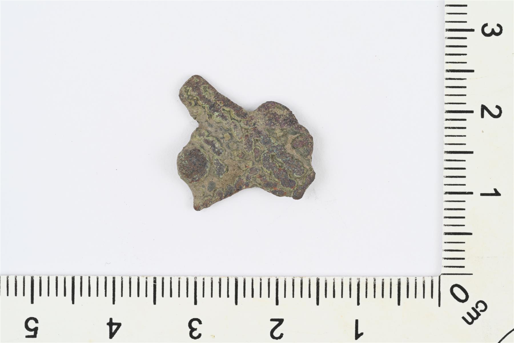| Koristellun litteän kupariseosesineen, mahdollisesti jonkin korun katkelma. | |