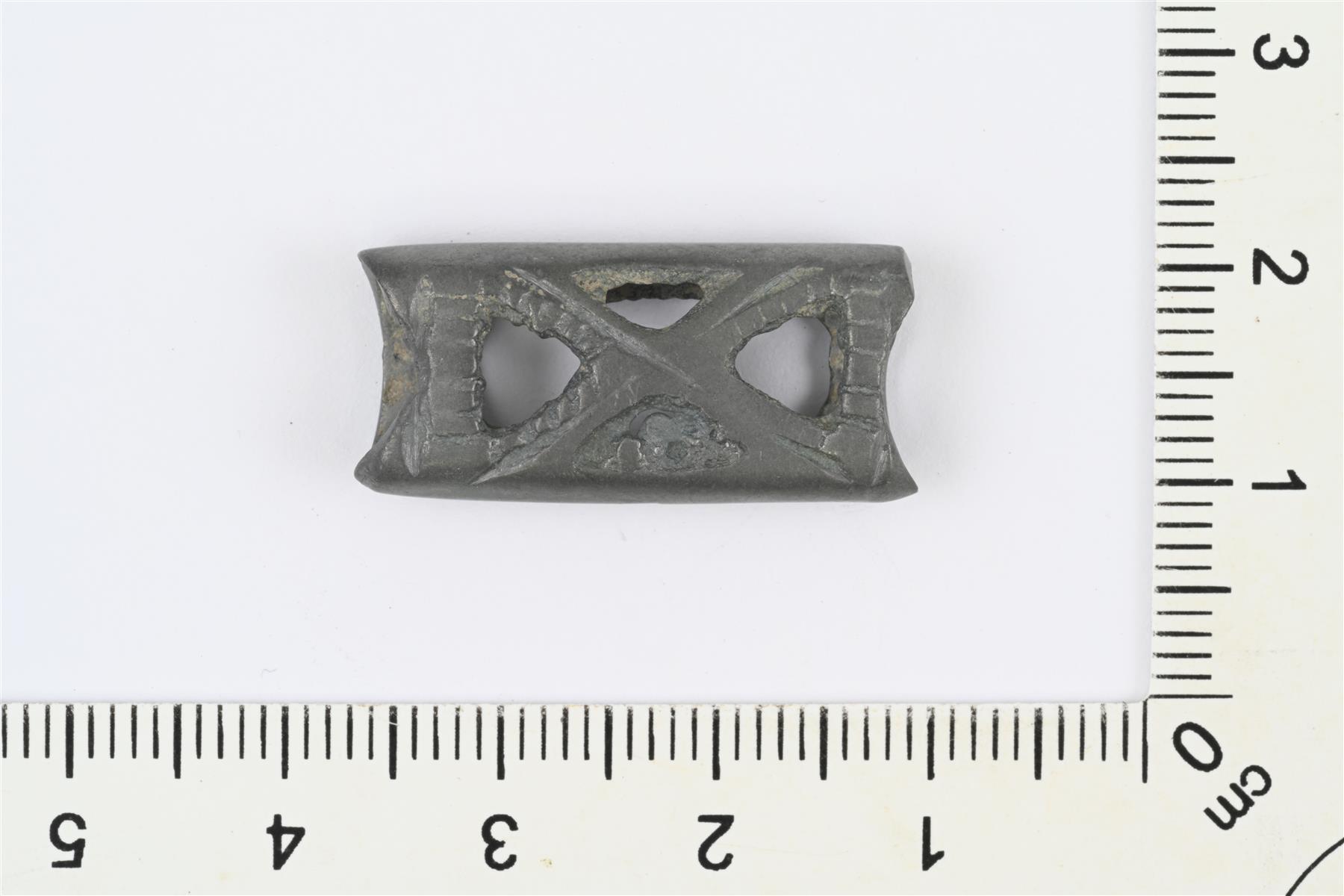 | Hihnanhela, ns. kasettihela. Hihnaan pujotettava, poikkileikkaukseltaan litteän soikea putki. Etupuoli puhkonainen ja koristeltu. Taustapuoli lähes kokonaan avonainen. | |