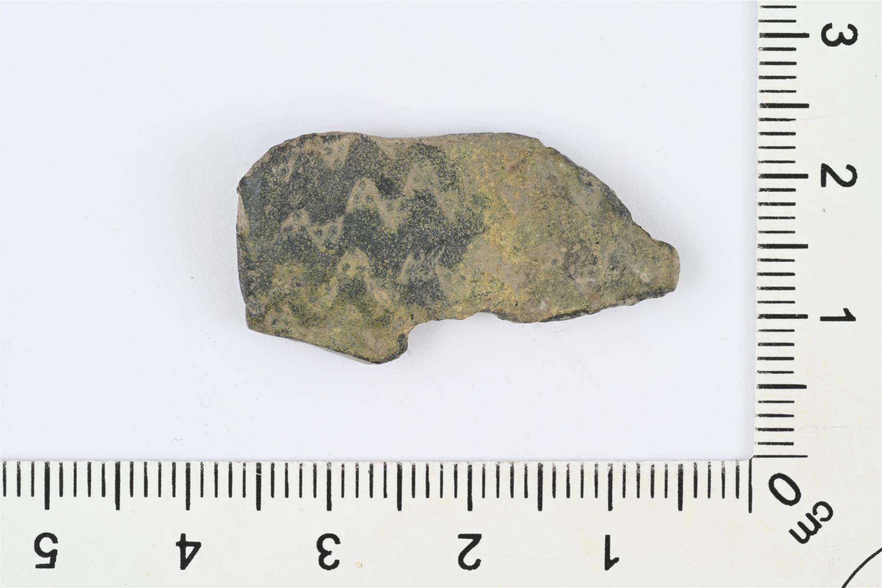 | Massiivisen rannerenkaan katkelma. Etupuolella koristeluna D-leimoja, joiden sisällä on kolme pistettä, leimat muodostavat aaltoviivoja. | |