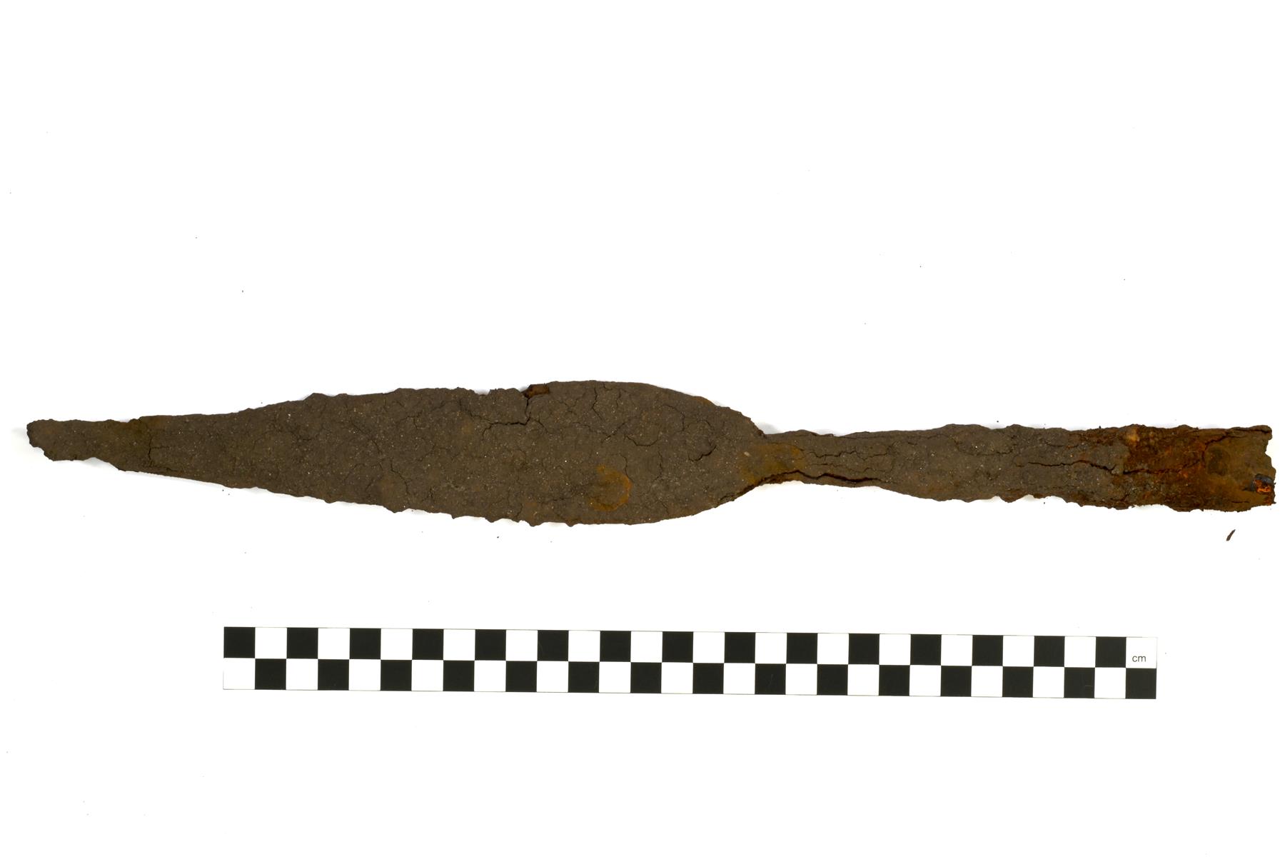 | Pahoin ruostunut keihäänkärki. Putki on pitkä ja poikkileikkaukseltaan pyöreä. Lehden levein kohta on lähellä tyveä ja teränsuut ovat kaarevat. Lehden poikkileikkaus on litteä vinoneliö. Pinnassa on hauras korroosiokerros, joka on paikoin lohkeillut. | |