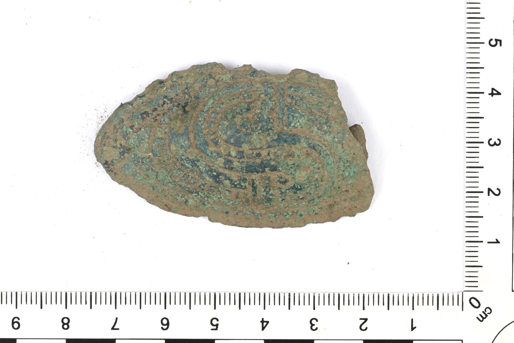 | Soikean kupurasoljen katkelma. Pinta on melko kulunut. Koristeluaiheena nauhaornamentiikkaa, jolle ei ole suoria vastineita Ailion luokittelussa. Muistuttaa hieman I-tyypin solkia. Taustapuolella on poikittainen varsi neulan kiinnitystä varten ja neulakota on yksinkertainen varsi (Ailio tyyppi CC1). | |