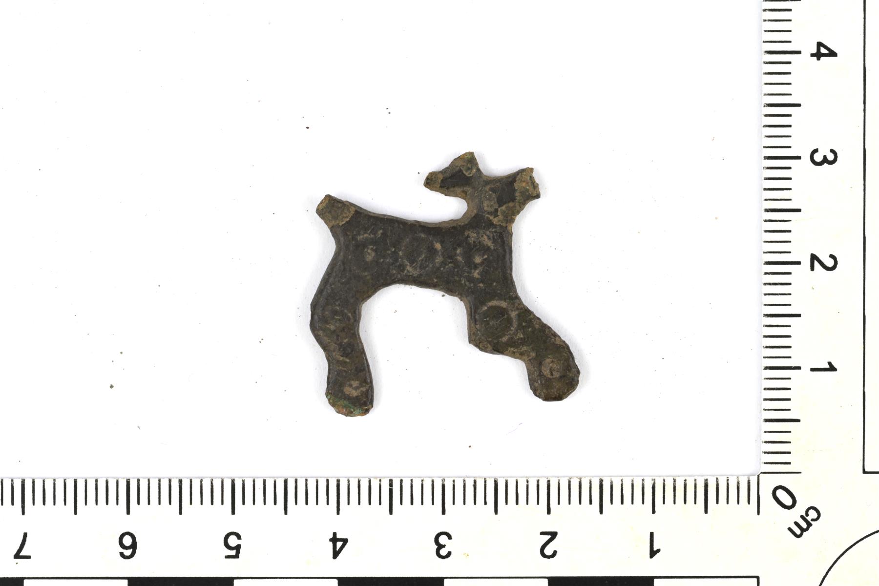 | Eläinriipuksen katkelma. Levymäinen ja koristeltu kummaltakin puolelta häränsilmäleimoilla. | |