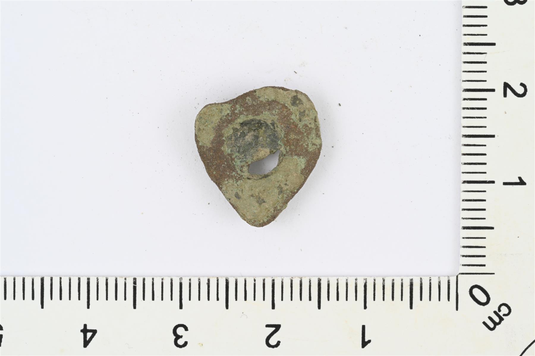 | Hela tms. Pyöristetyn kolmion muotoinen litteä esine, jonka keskellä reikä ja kulmissa taustapuolella pienet terävät tapit. | |